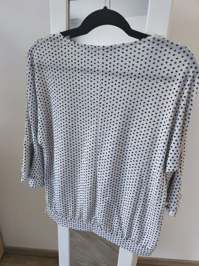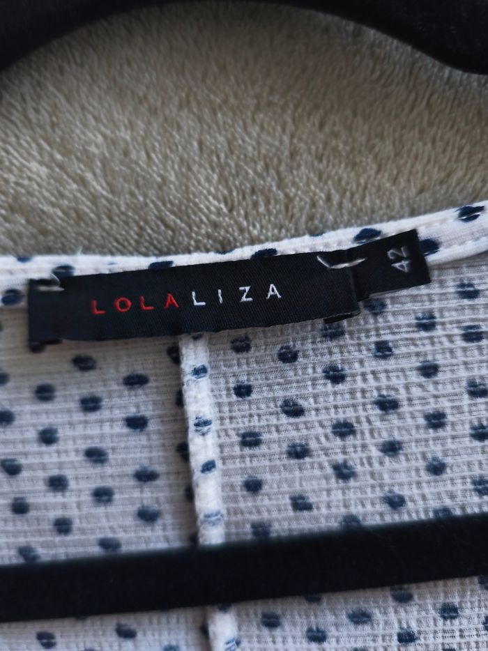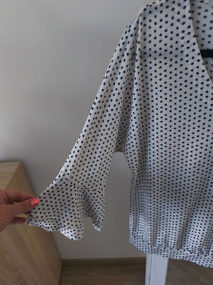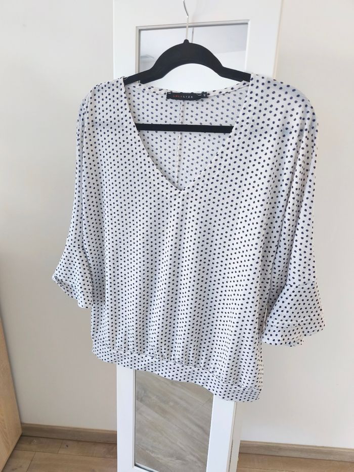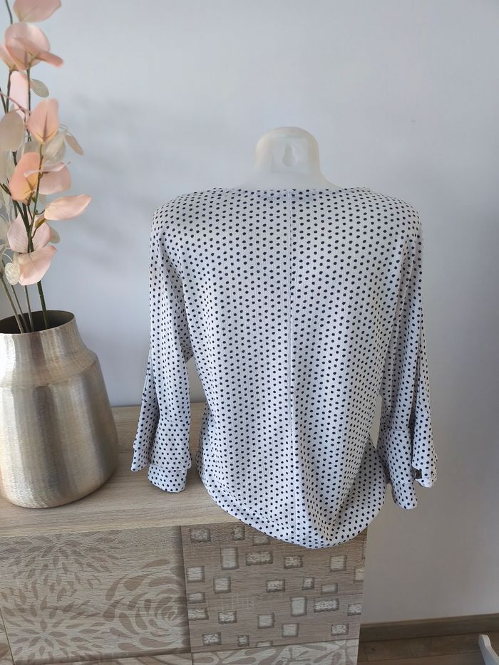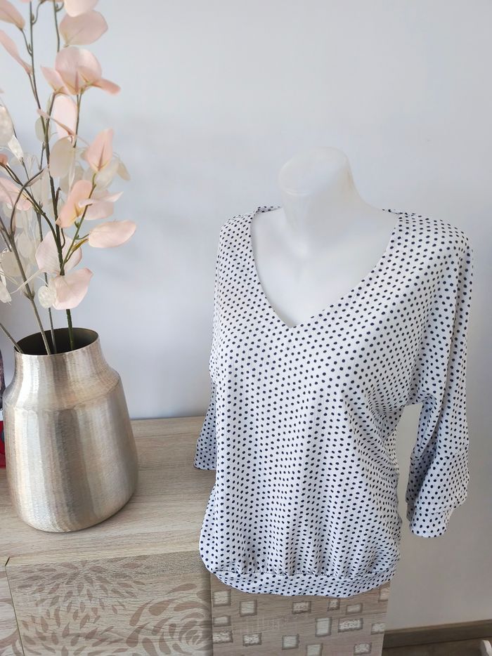 Blouse Lola Liza Blanche et pois bleu marine Décolleté V Manches 3/4 avec petits volants Taille 42 Maison non fumeur et sans animaux Envoi possible le jour même avec mondial Relay ou Chronopost ou remise en main propre sur Saleilles #ldura42