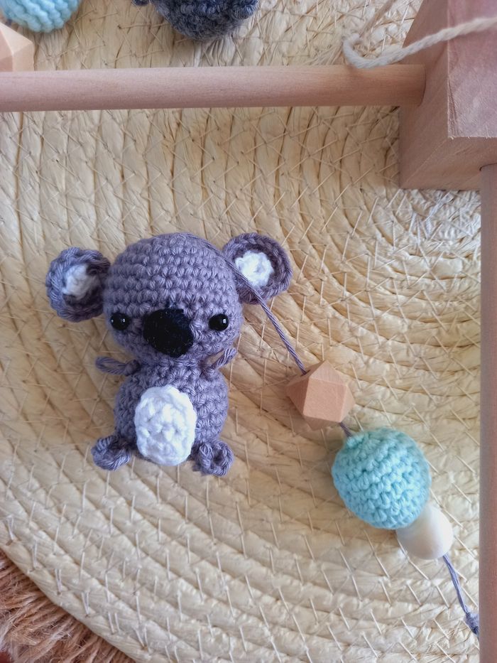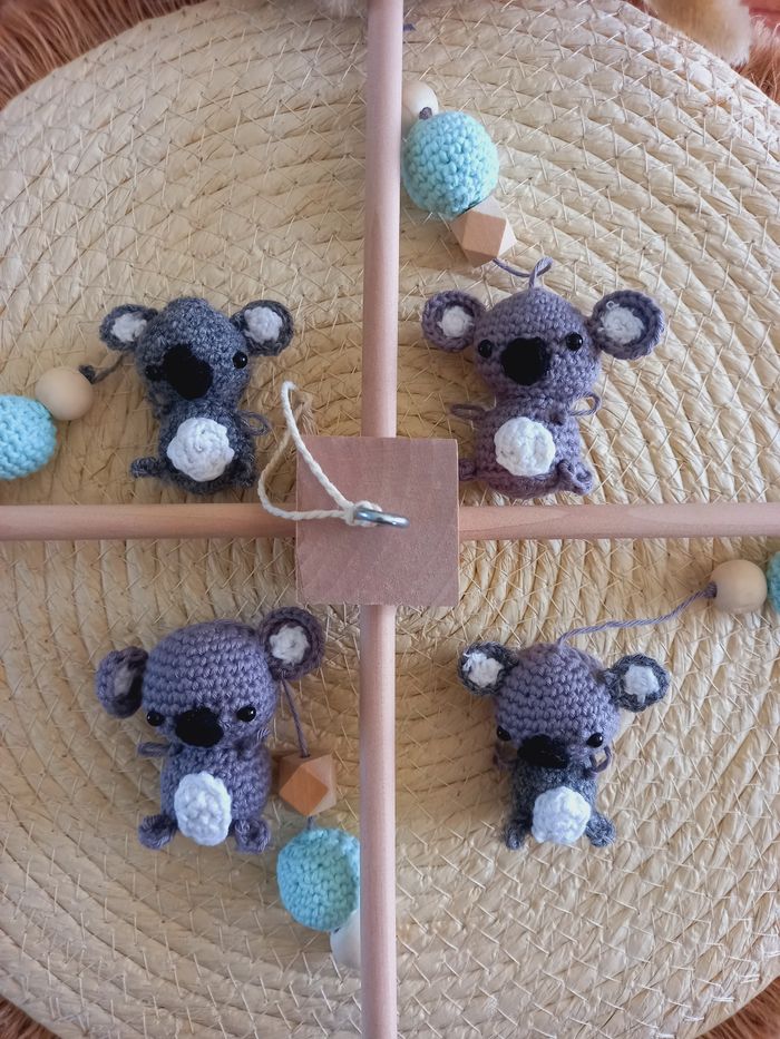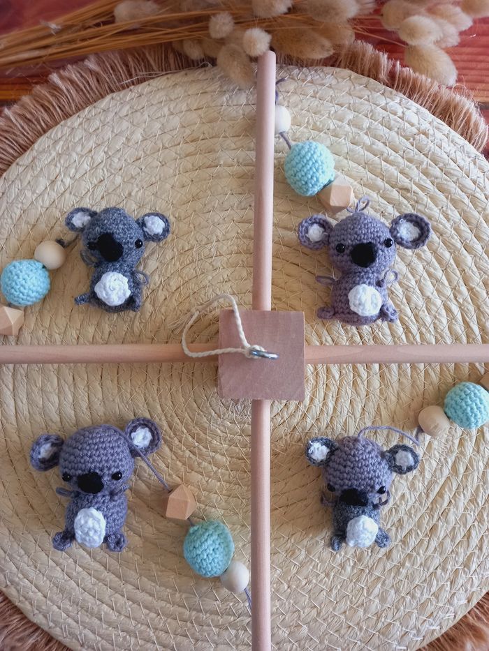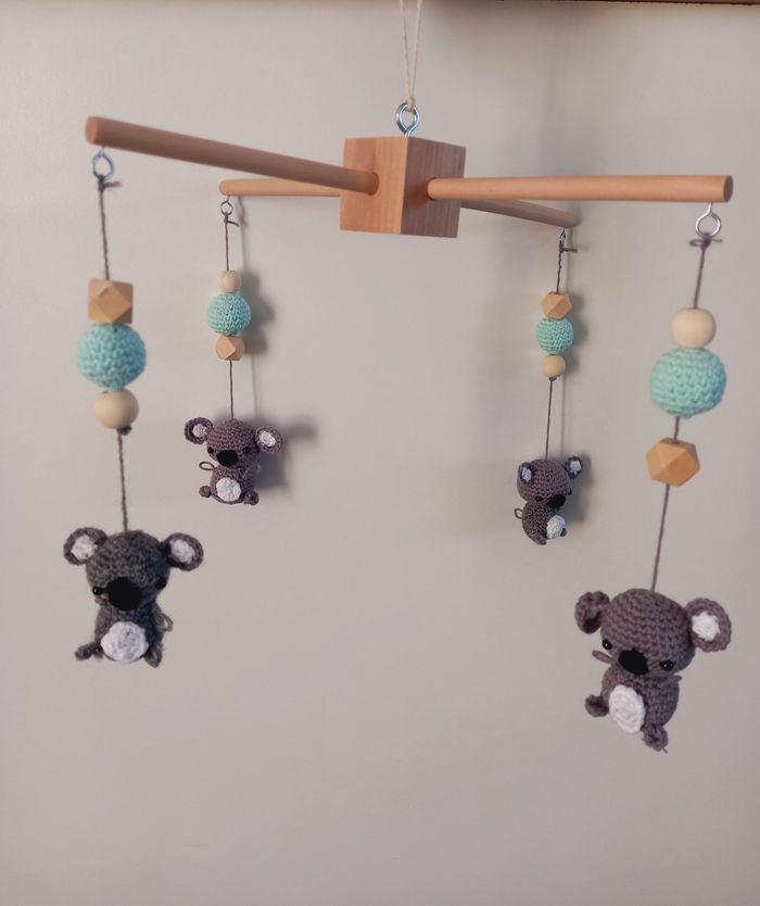 Pour votre bébé adorable mobile croix en bois naturel, décoré avec de petites perles en bois,perles au crochet vert d'eau/vert sauge ainsi que quatre minis koalas