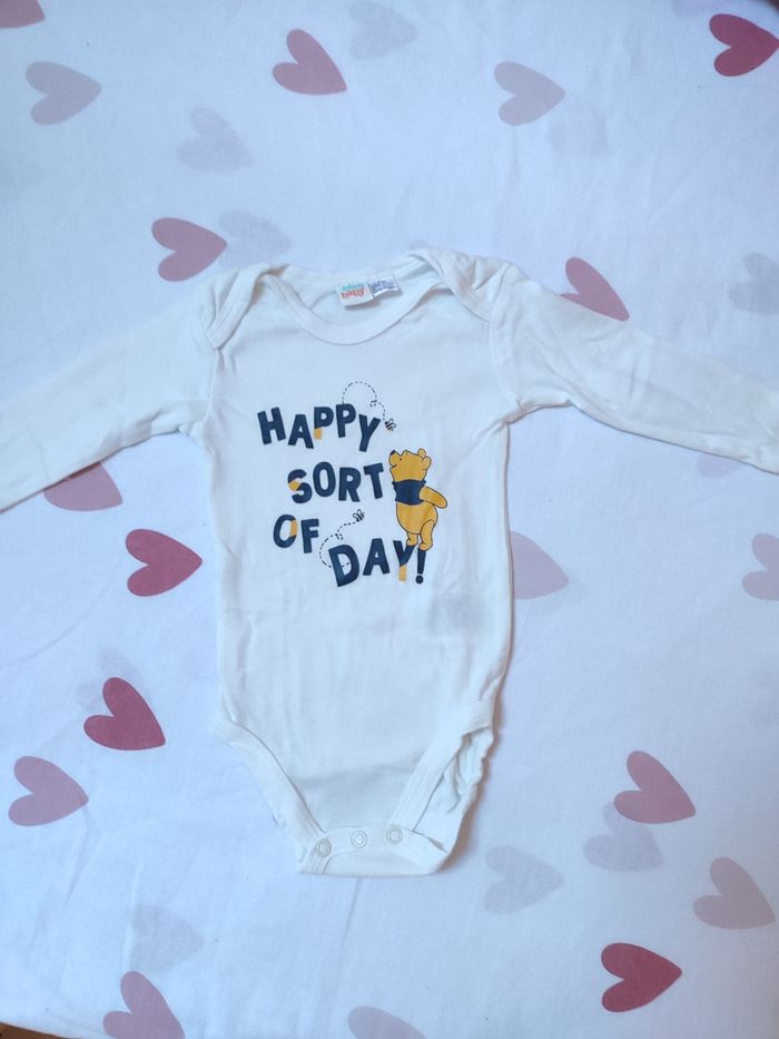• 1 bodie manches longues blanc avec motif Winnie l'ourson et inscription "Happy sort of day !" ;