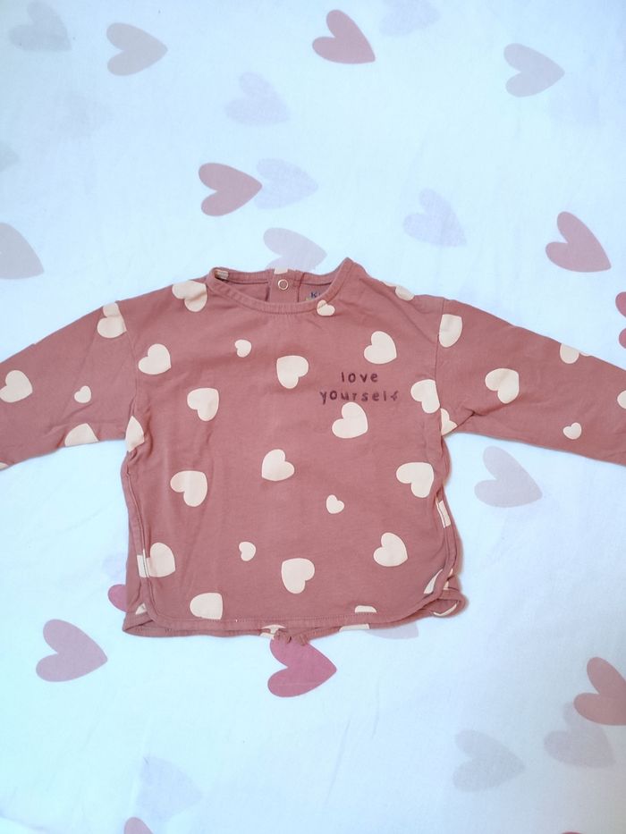 • un tee-shirt vieux rose avec motifs cœurs et inscription "love yourself" ;