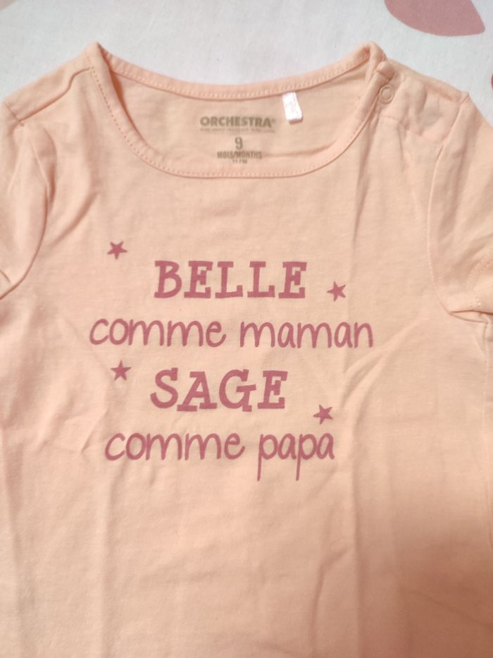 🌸 Adorable tee-shirt manches courtes de la marque Orchestra. 🌸 Taille 9 mois. 🌸 Couleur pêche avec inscription "Belle comme maman, sage comme papa". 🌸 Pratique et confortable. Boutons pression à l'épaule pour faciliter l'habillage. 🌸 Très bon état. 🌸 N'hésitez pas à aller faire un tour sur mon dressing, plein d'articles bébé/enfants. 🌸