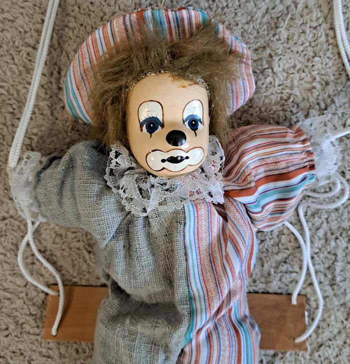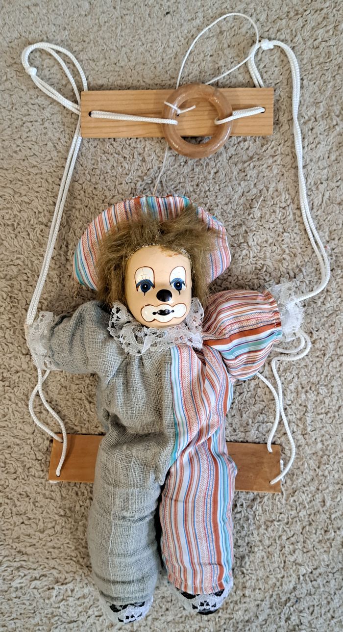 🪆 Poupée en porcelaine - clown sur balançoire