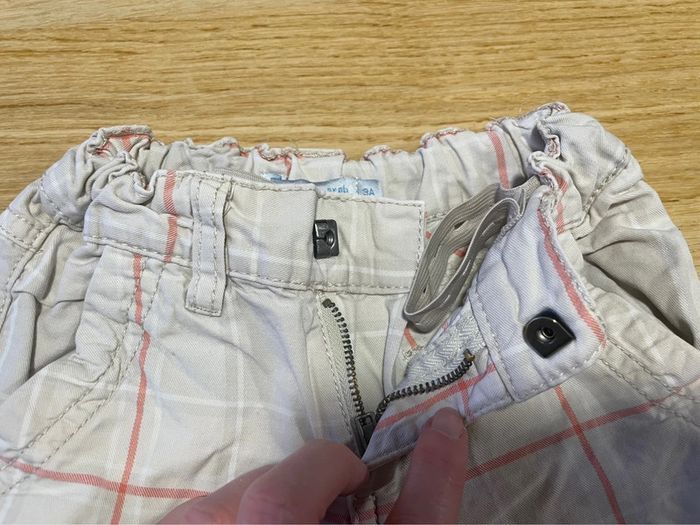Lot 2 bermudas garçon Un couleur crème à carreaux rouges, taille élastique, marque Gémo Un blanc à carreaux bleu, marque Tape à l’œil, Tous 2 resserrables par boutons et élastique Taille 3 ans