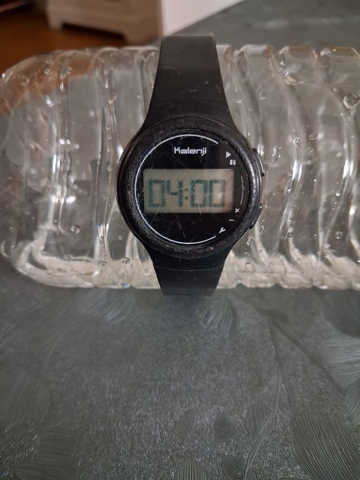 Montre Quartz Kalenji Marque Décathlon Bracelet en plastique noir Fonctionne très bien mais quelques petites rayures sur l'écran ( voir photo)