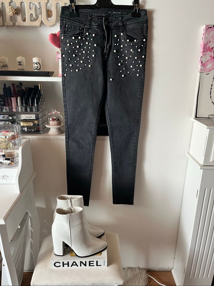 Jean noir délavé avec perles blanches regular woman T.S TBE 👖
