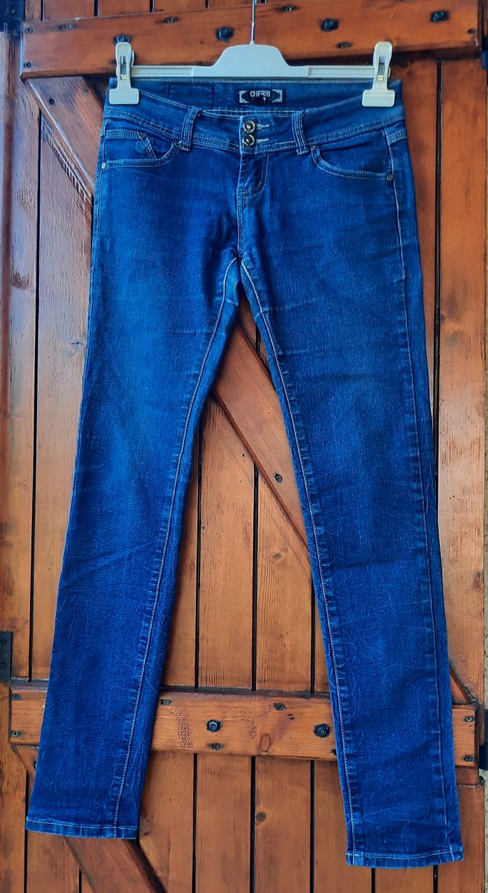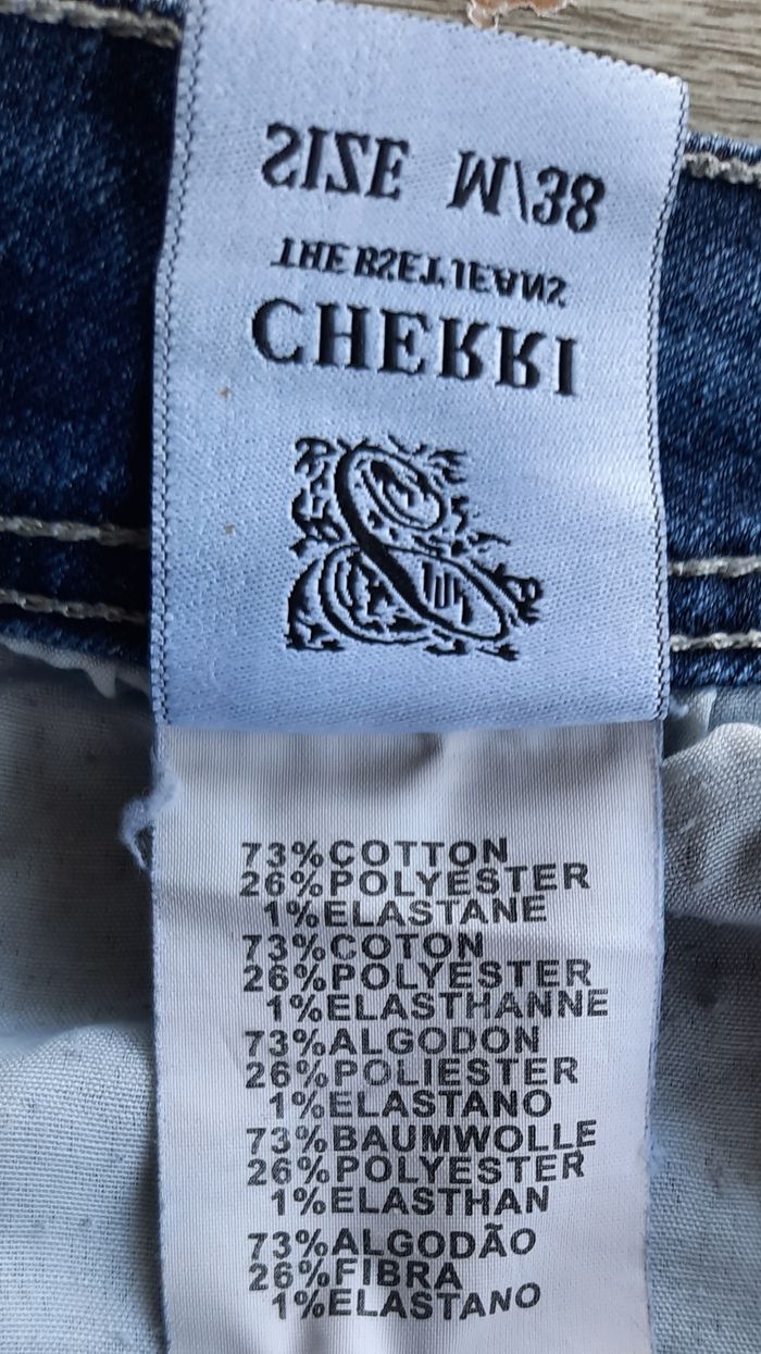 Jean femme de la marque Cherri, de couleur bleu. - Type de produit : Jean skinny, taille basse - Marque : Cherri - Taille : M/38 - Couleur : Bleu - taille à plat : 37 cm - hauteur à partir de l'entrejambe : 76 cm - hauteur totale : 95 cm 73 % coton, 26 % polyester et 1 % élasthanne