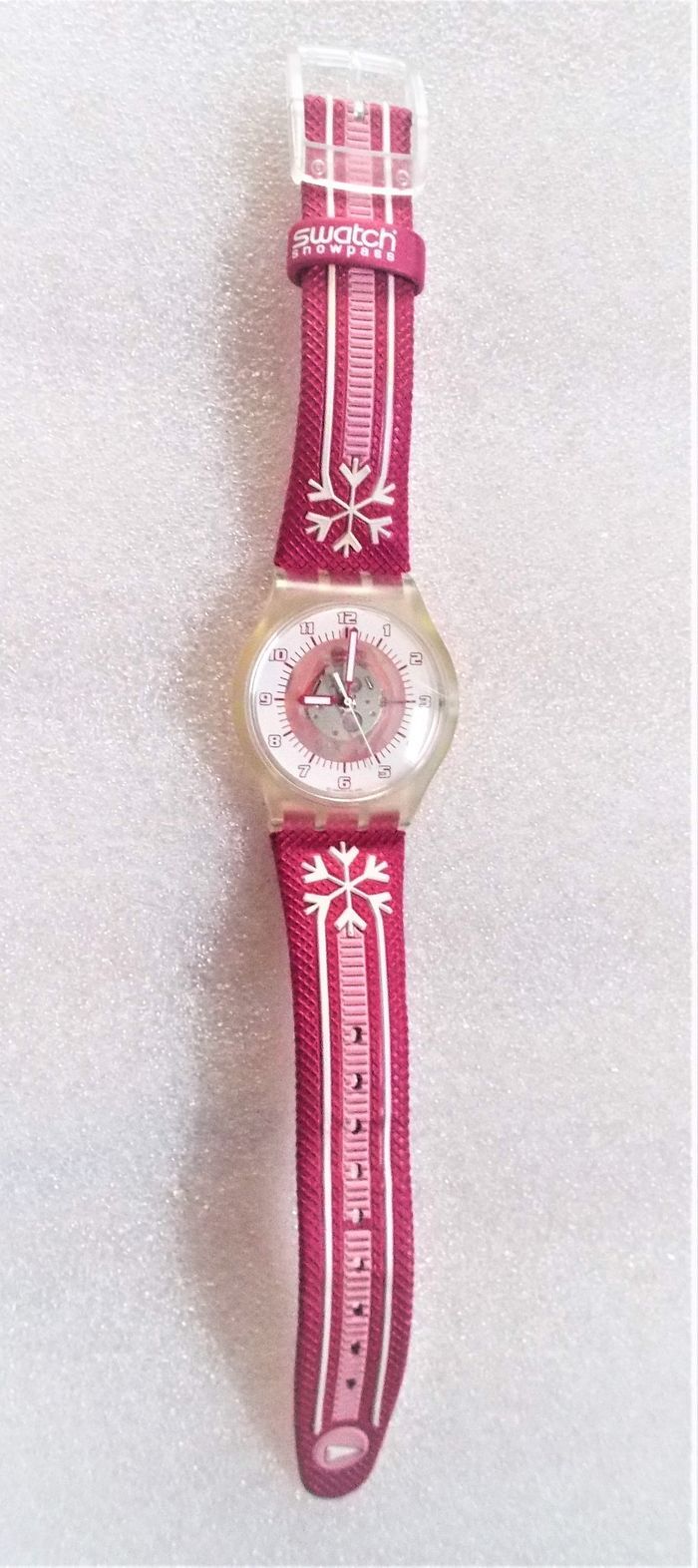 Montre SWATCH Collecteur "Pink Ring", SUMK 100, Collection Jelly Snow Pass 2008, boitier transparent de 34 mm, à intérieur blanc et rose et mécanisme apparent squelette, chiffres et aiguilles rose et blanc, bracelet en textile sur cuir rose et blanc, motifs flocons, en parfait état de fonctionnement, pile fourni, prix définitif.