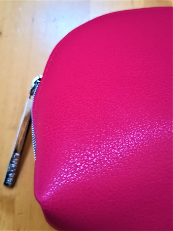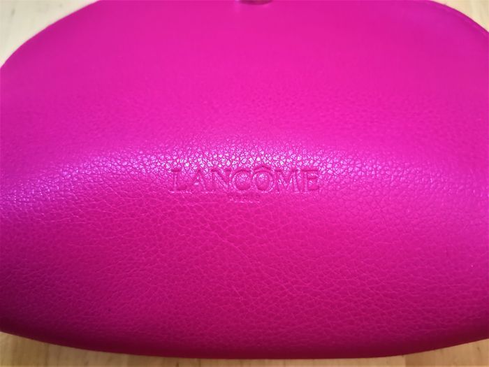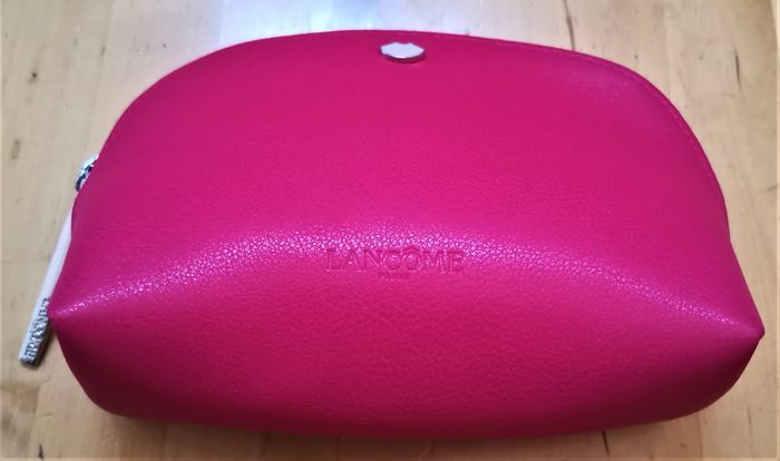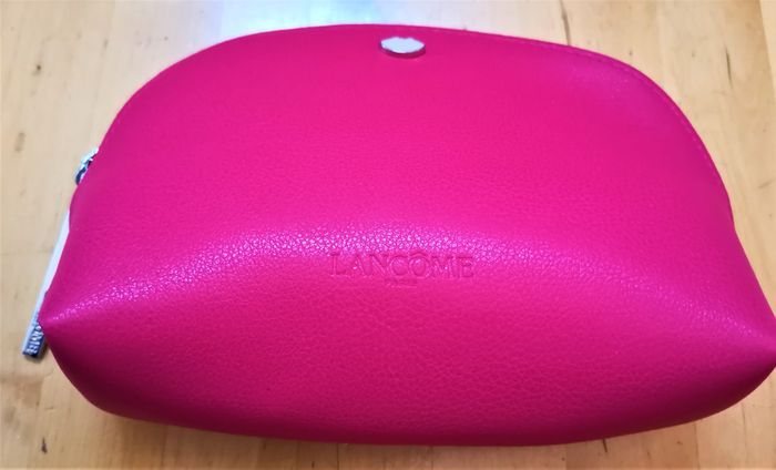 Trousse maquillage "Lancôme", façon cuir, couleur magenta, fermeture zippé, dimensions: 18 cm x 14 cm, neuve.