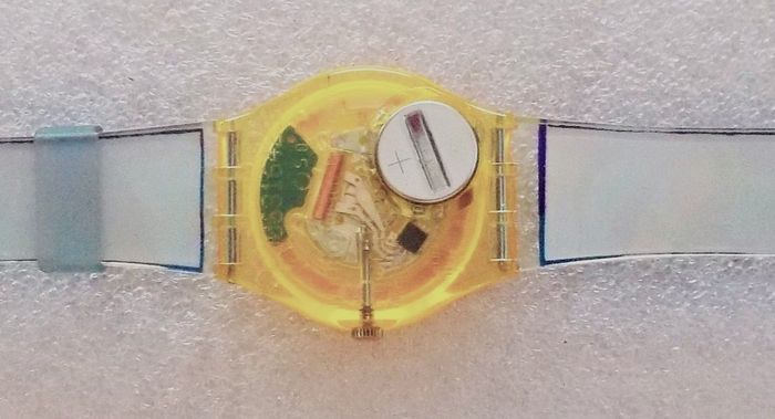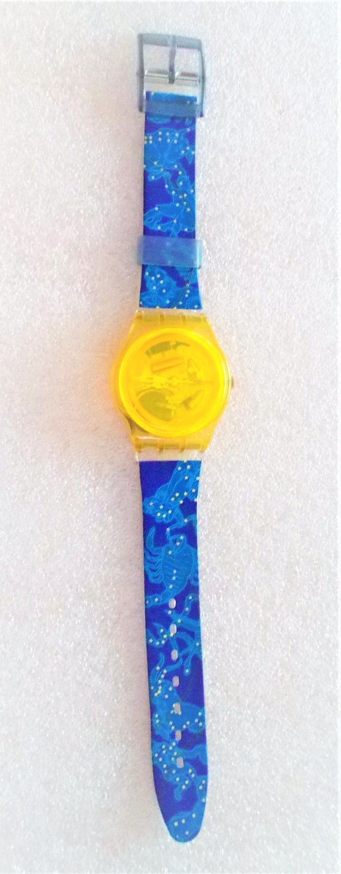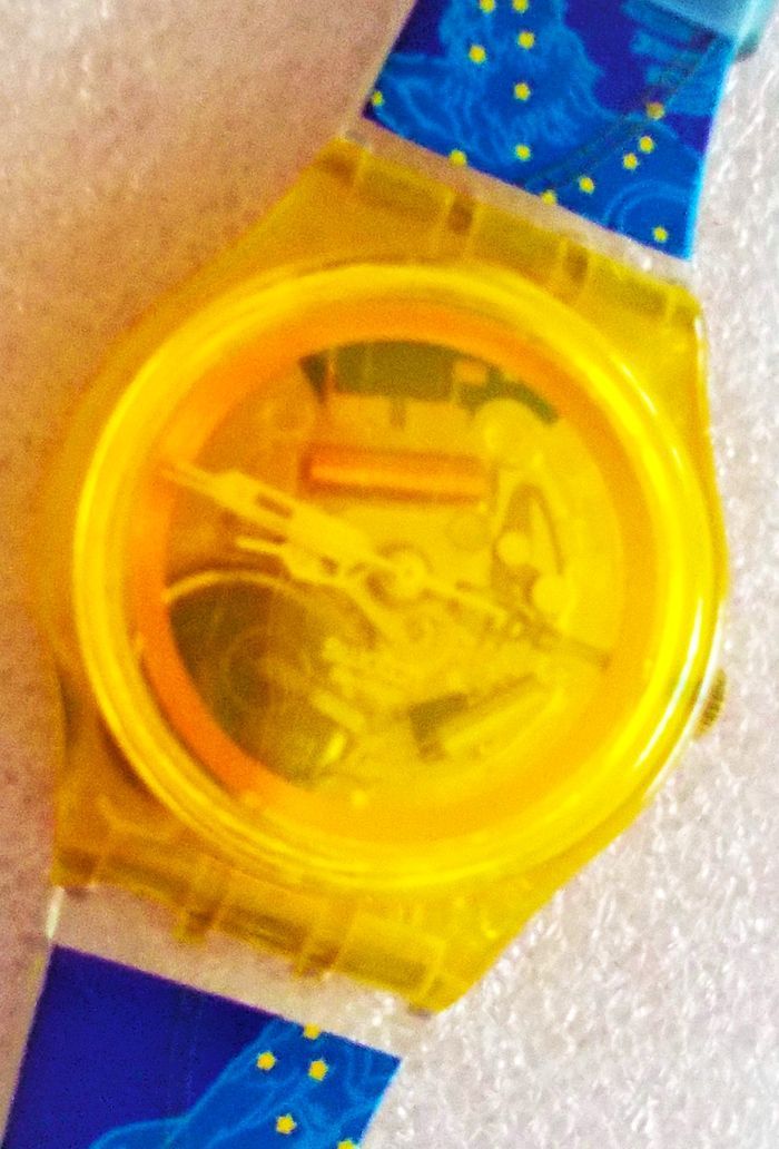Montre SWATCH Collecteur "Moonstruck", SKK 115, Collection Snow Pass 2004, boîtier jaune doré de 34 mm, à mécanise intérieur visible (squelette), et bracelet bleu à motifs assorti qui ne pas d'origine, en parfait état de fonctionnement, pile fourni, prix définitif.