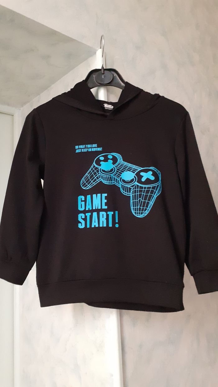 Vends un tee-shirt manches longues, à capuche, forme sweat, 100 % polyester, couleur noir avec motif bleu devant, marque Shein, taille 6 ans. Longueur de l'épaule la base : 46 cm.