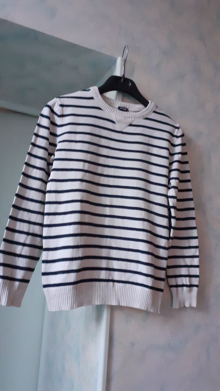 Vends un pull 100 % coton, couleur blanc rayé marine, marque Kiabi, taille 8 ans (126-131 cm). Longueur de l'épaule à la base : 49 cm.