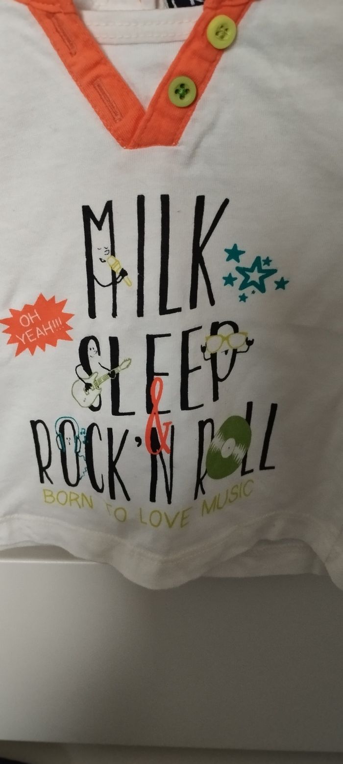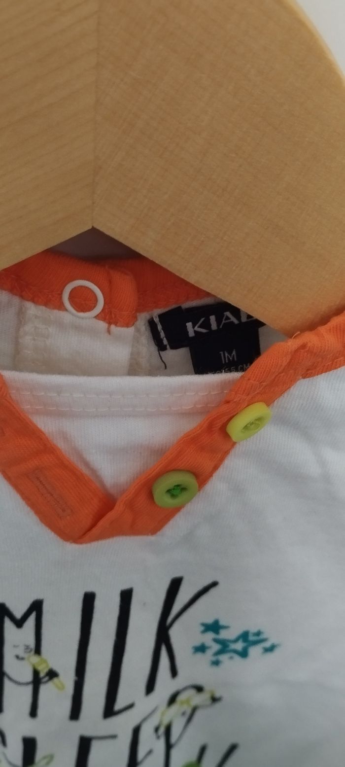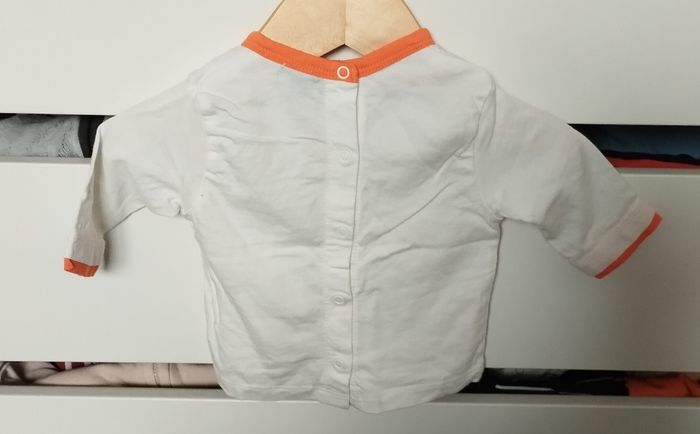 Bonjour, Je vends ce t-shirt ML pour garçon en taille 1 mois de la marque Kiabi en très bon état