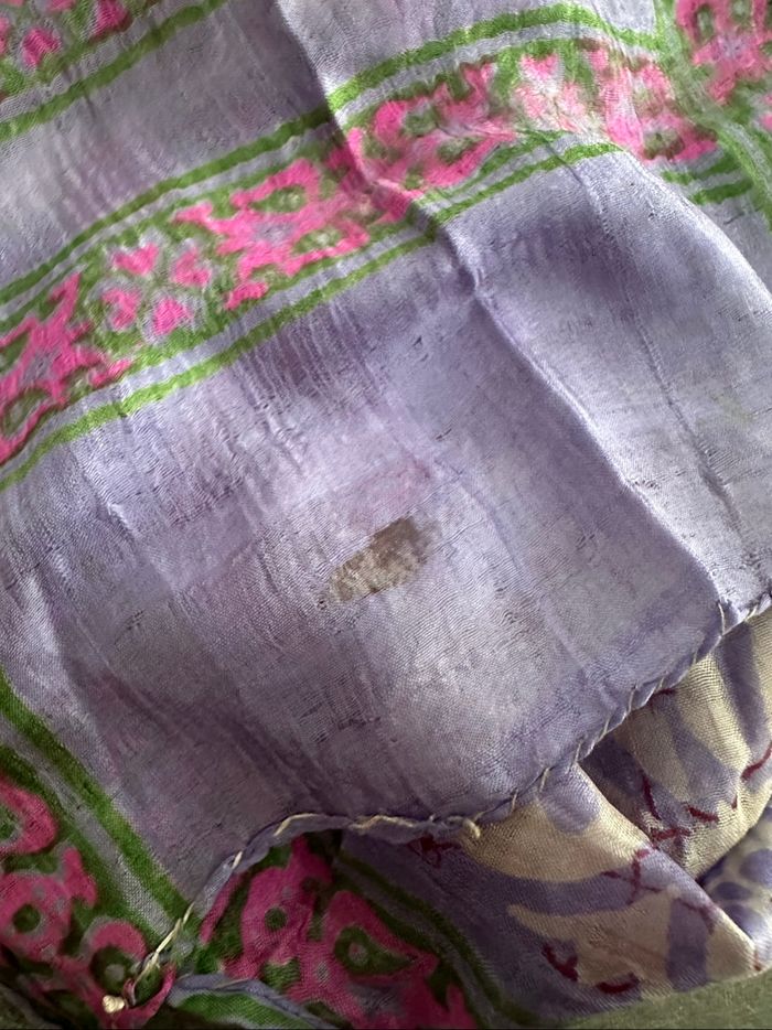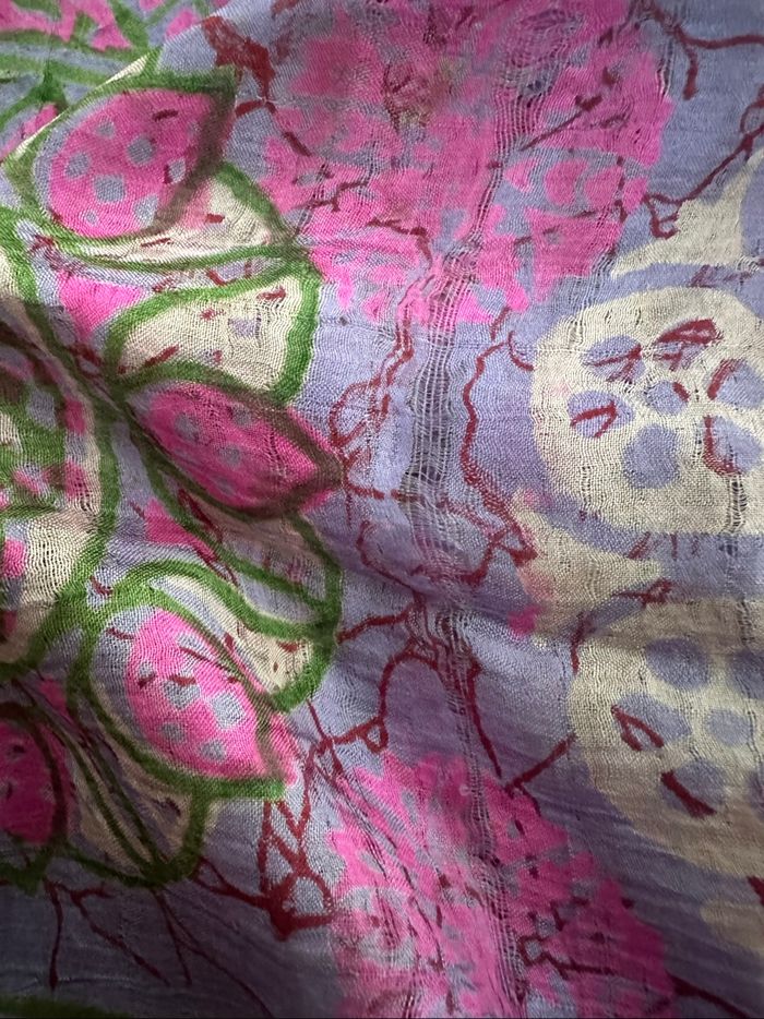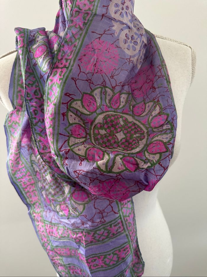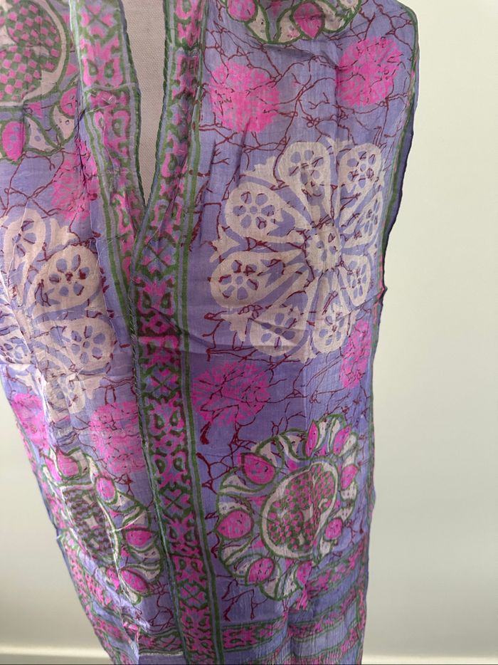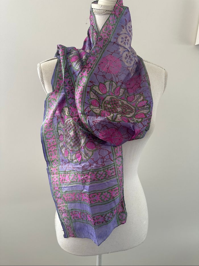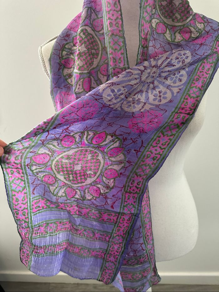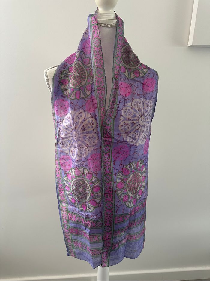Foulard étole - État satisfaisant (voir photos) - Rose fuchsia et violet lila - Imprimés rosaces - Forme rectangulaire - 100% soie - Vintage, années 70-80’ - Fabriqué à Kuala Lumpur - 24x170cm