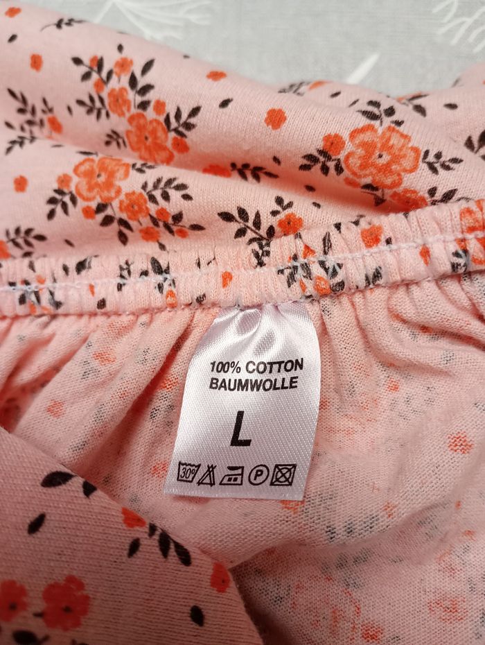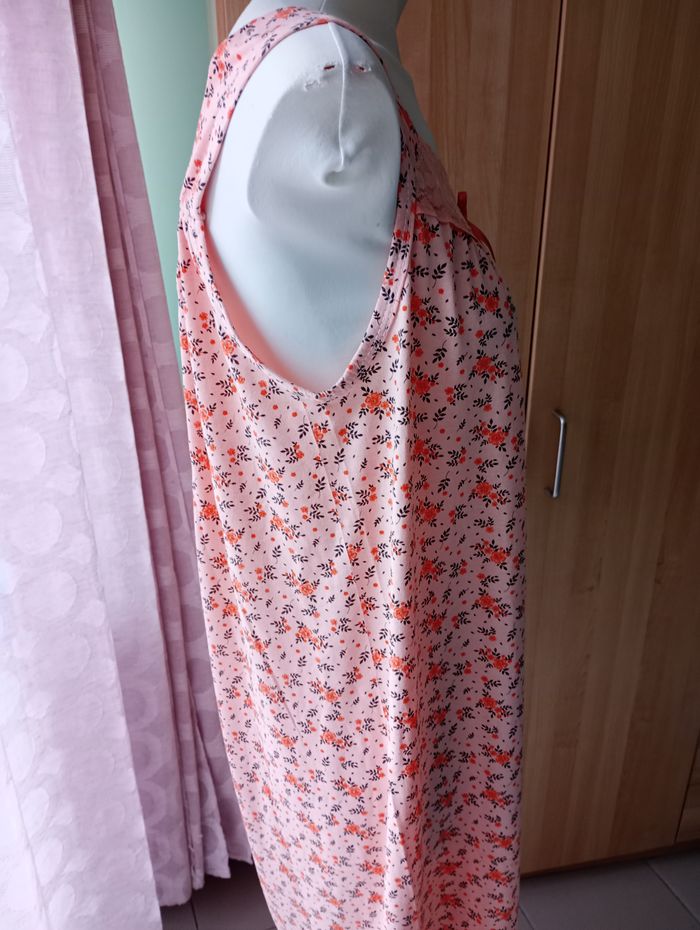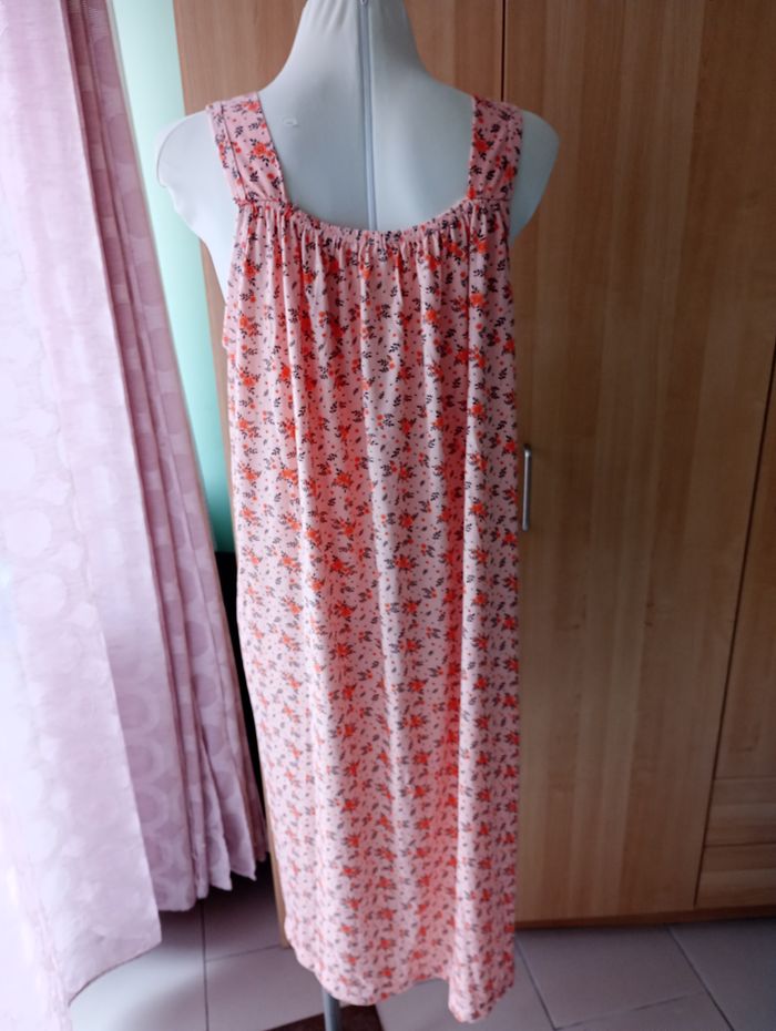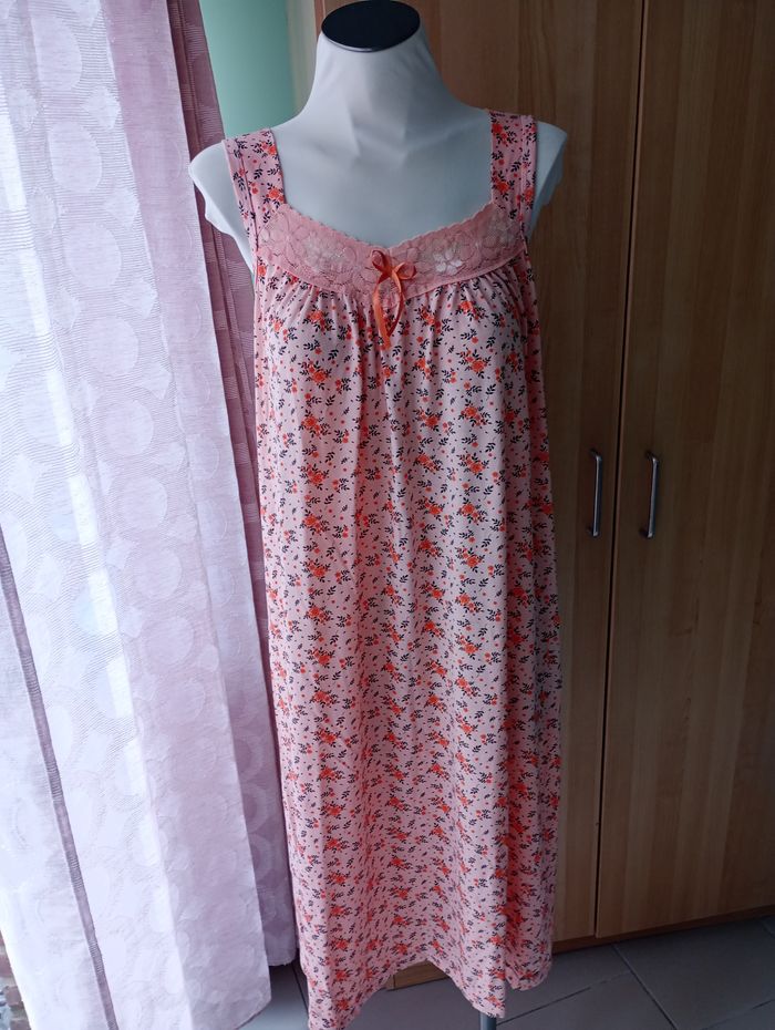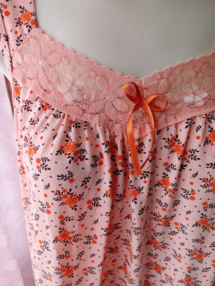 Nuisette légère, sans manche avec dentelle. Tons pêche. 100% Coton. Longueur : 116 cm. Largeur entre aisselles : 55 cm. Sans marque. Etat impeccable.