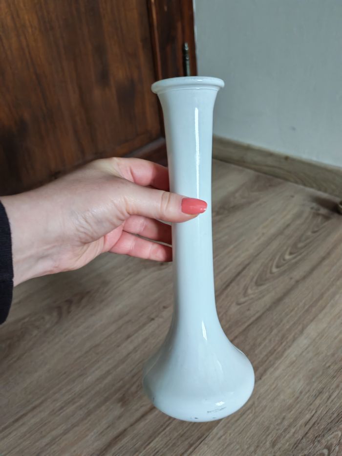 Vase soliflore en verre pellicule blanche sur verre transparent. Petit vase eb très bon état, sans ébréchures, la pellcule est légérement partie sur le bas du vase. Dimensions : Hauteur : 24,5 cm Diamètre bas : 9 cm Diamètre haut : 5 cm(ext.), 3,5 cm (int.) Poids : 429g