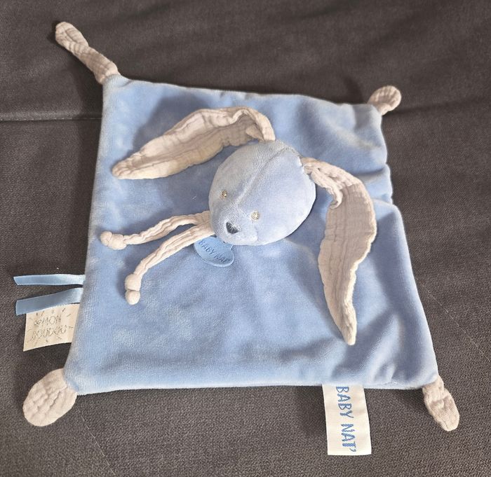 Lien attache tétine lange de couleurvbleu sur le coin du doudou.