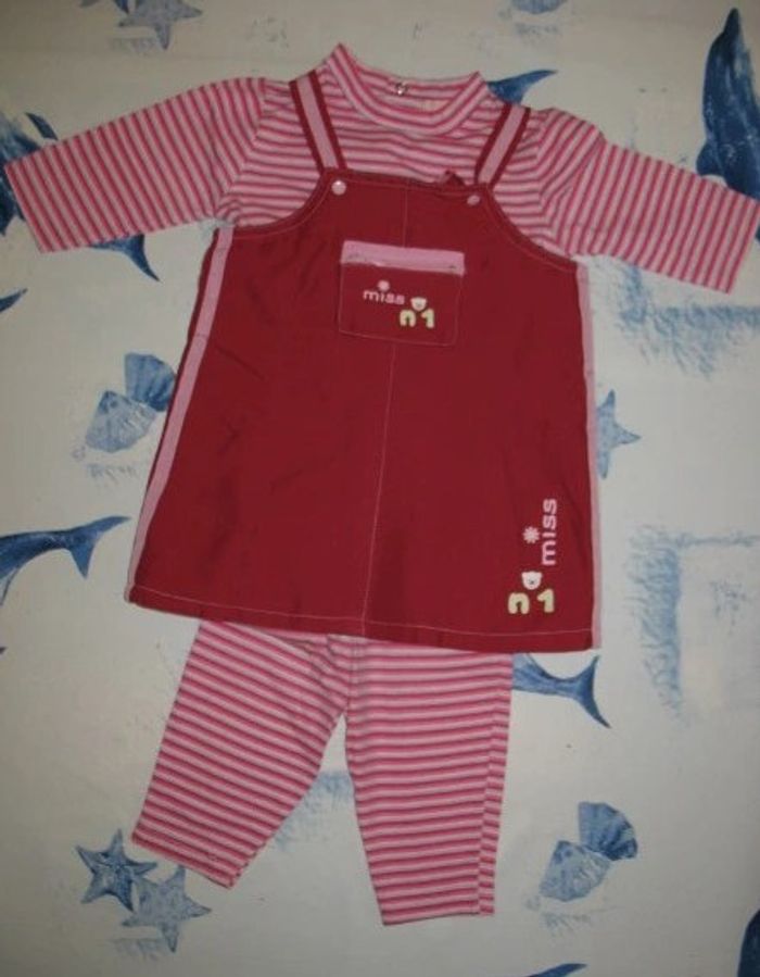 #6Mois_Bébé_Fille_Nathg2210 ENSEMBLE 3 PCS BÉBÉ FILLE : ROBE + PULL + CALEÇON "KIMBALOO BY LA HALLE" - 6 MOIS - n°01 Robe ou jupe salopette rose fuchsia - Pressions bretelles - 1 poche avec zip devant - Pressions dos - Écriture : Miss N°1 dans le bas - Matière : 100% polyester. Sous Pull rayé rose - Col rond - Fermeture par pressions dos : Matière : 100% coton. Possibilité d'envoyer d'autres photos sur simple demande. Maison non-fumeur - Sans animaux. Réduction lot activée. Allez voir mes autres ventes, je vide les placards. Beaucoup de vêtements de marque et beaucoup de jouets. Remise en mains propres ou possibilité d'envoi au tarif en vigueur à votre charge. Retour Refusé. Pour tout renseignement, n'hésitez pas à me contacter, je répondrai volontiers à vos questions. Réponse Assurée. Pour Consulter mes autres annonces tapez Nathg2210.