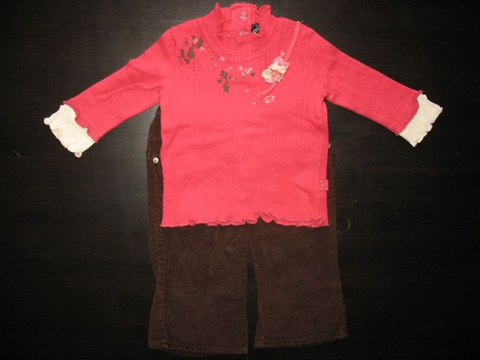 #6Mois_Bébé_Fille_Nathg2210 ENSEMBLE 2 PCS BÉBÉ FILLE : PANTALON "OBAIBI" + TEE SHIRT "JEAN BOURGET" - 6 MOIS - n°04 Pantalon velours marron - Fermeture par pression - Taille réglable par élastique sur les côtés - Plusieurs poches - Matière : 100% coton "OBAIBI". Tee shirt ajouré à manches longues rose fuchsia - Col rond montant - Pressions dos - Bas des manches écrues - Motifs devant - Fleur en relief - Matière : 100% coton "JEAN BOURGET". Article d’occasion en très bon état - Sans trou - Ni tache - Lavé et repassé pour la vente. Possibilité d'envoyer d'autres photos sur simple demande. Maison non-fumeur - Sans animaux. Réduction lot activée. Allez voir mes autres ventes, je vide les placards. Beaucoup de vêtements de marque et beaucoup de jouets. Remise en mains propres ou possibilité d'envoi au tarif en vigueur à votre charge. Retour Refusé. Pour tout renseignement, n'hésitez pas à me contacter, je répondrai volontiers à vos questions. Réponse Assurée. Pour Consulter mes autres annonces tapez Nathg2210.