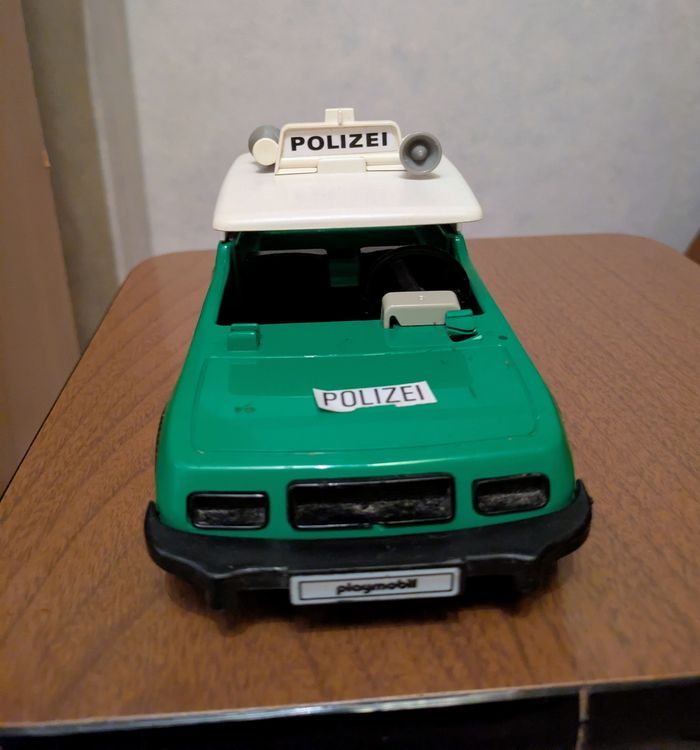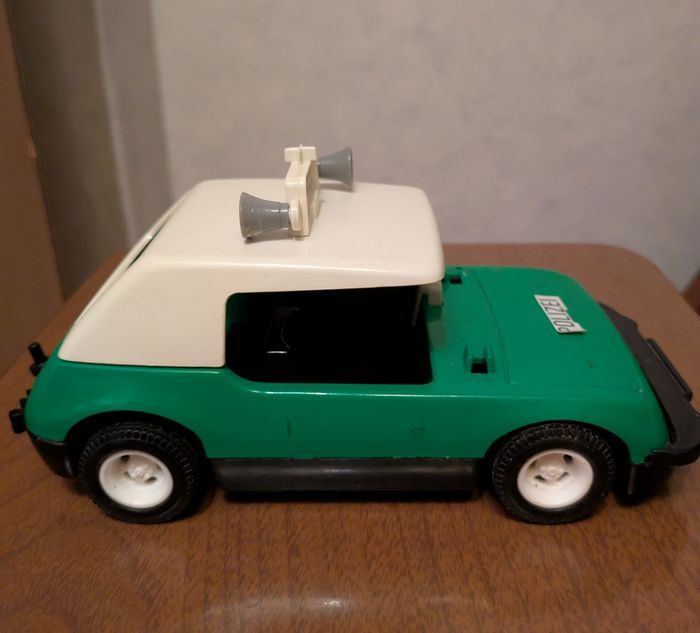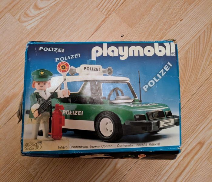 Boite playmobil vintage 3215 années 80 avec ses accessoires Une voiture de police, une figurine de policier plus accessoires Pare brise du véhicule et antenne sont manquants Bon état figurine et accessoires Boîte d'origine abîmée