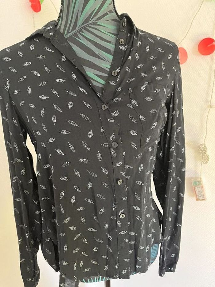 Blouse noire manches longues Motif plumes blanches Taille S 36 clockhouse Bon etat : motif un peu effacé au niveau des aisselles voir photos