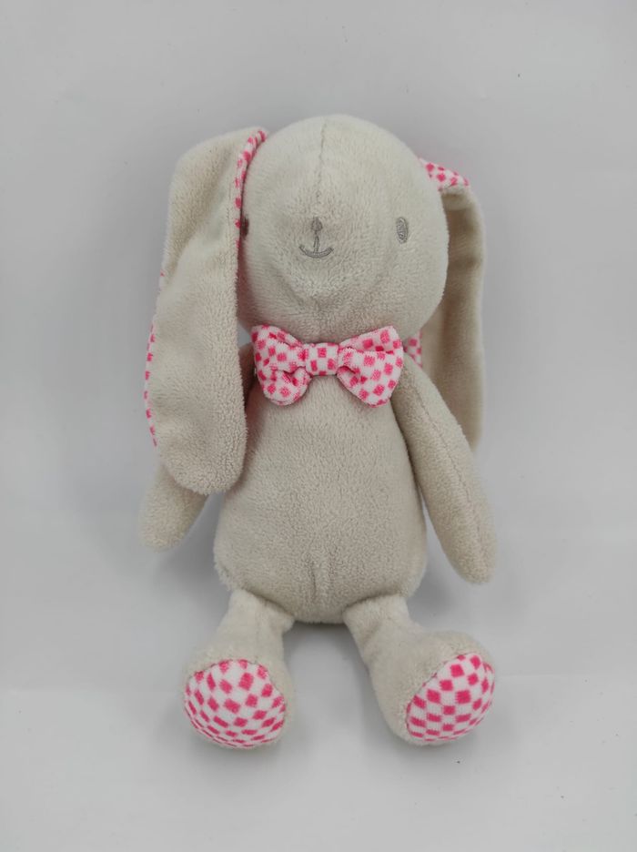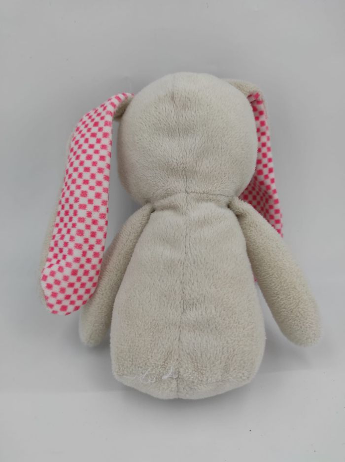 🐇 Doudou Lapin beige avec empiècements de tissus à carreaux vichy rose et blanc, Klorane