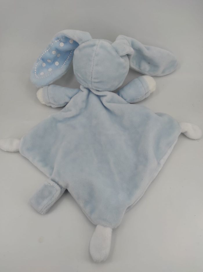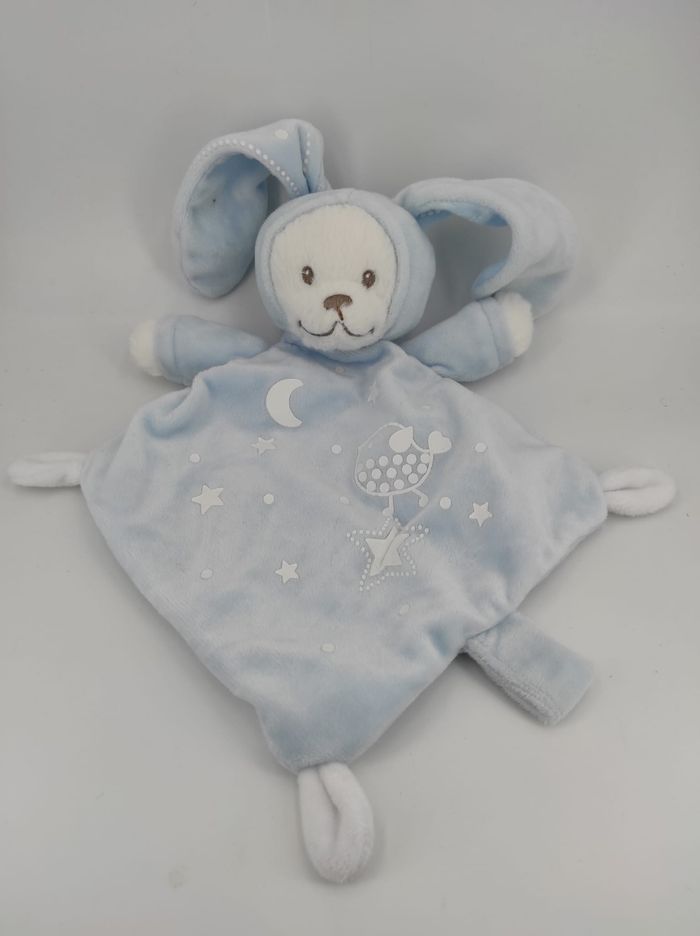 🐇 Doudou Plat Lapin Bleu et Blanc avec flocage luminescent et attache tétine