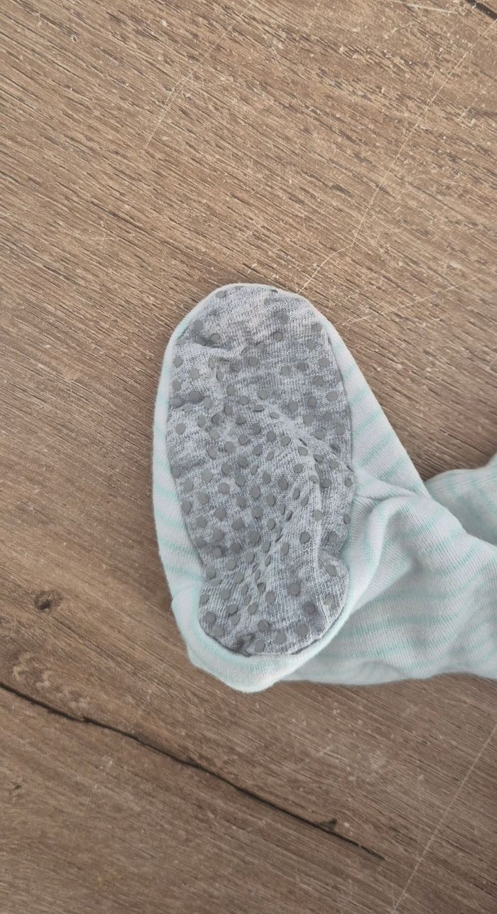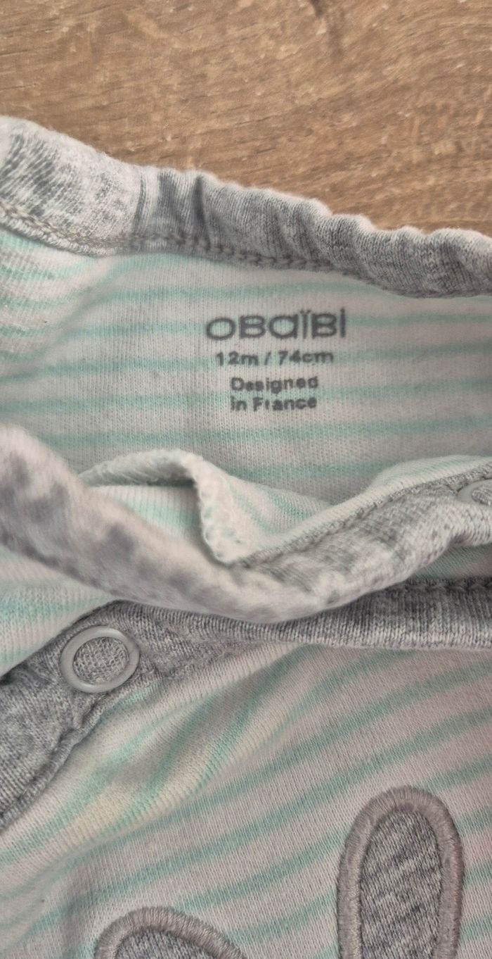 Pyjama grenouillère en coton rayé à motif lapins Fermeture par boutons pression à l'avant, système antidérapant sous les pieds Obaïbi taille 12 mois Bon état (petite tâche au-dessus du lapin et manque des antidérapants sous les pieds, voir photos)