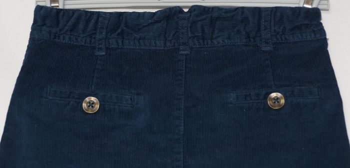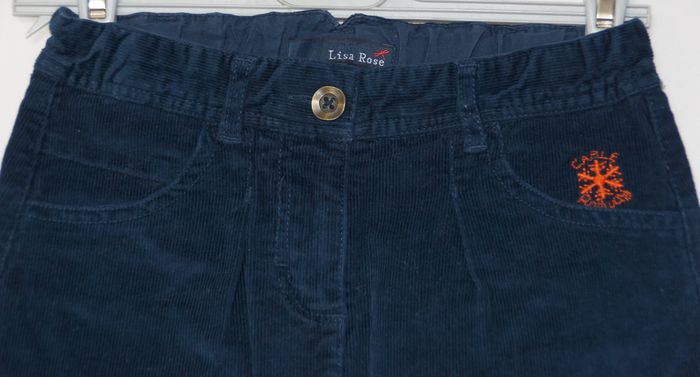 Velours fines rayures 2 poches devant et 2 fausses poches dos Logo brodé orange Fermeture zip et bouton Plis sous la ceinture Elastique intérieur réglage taille