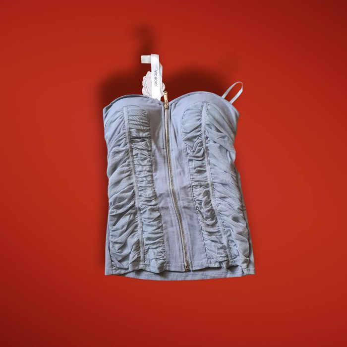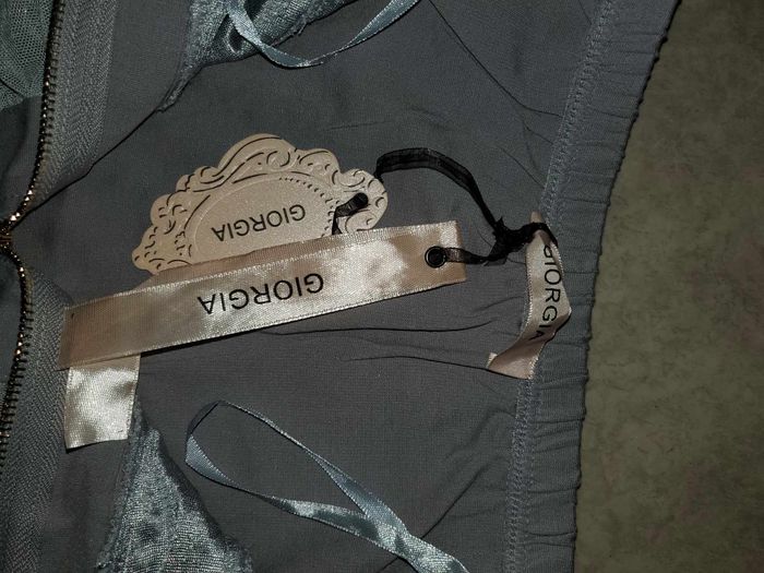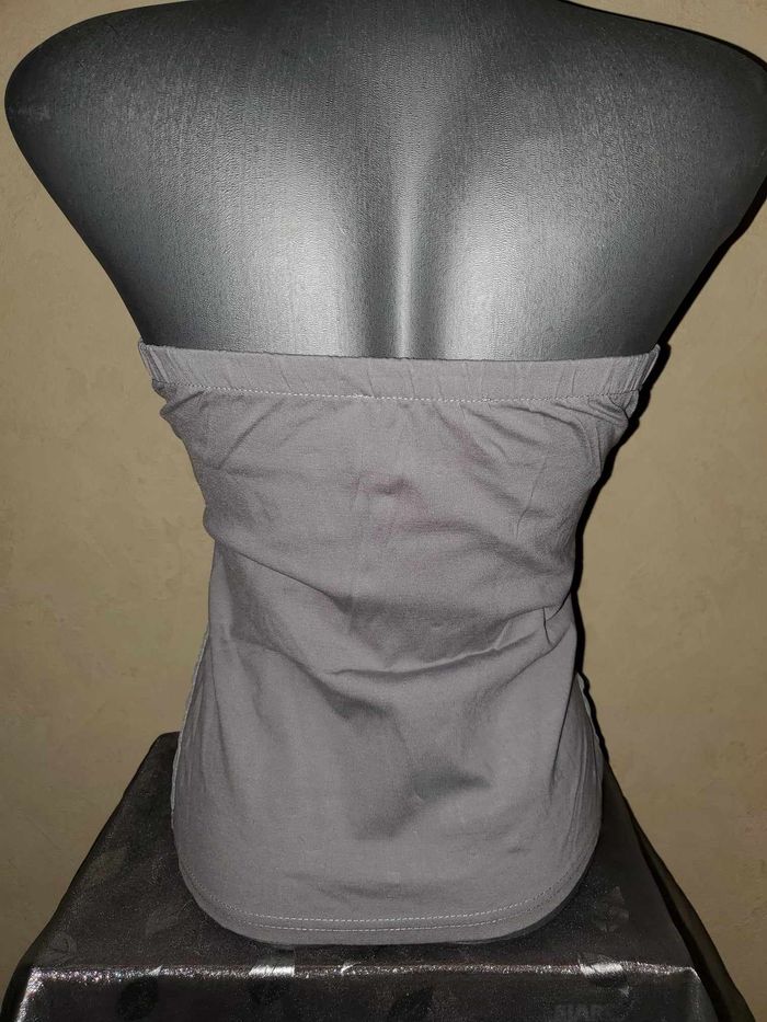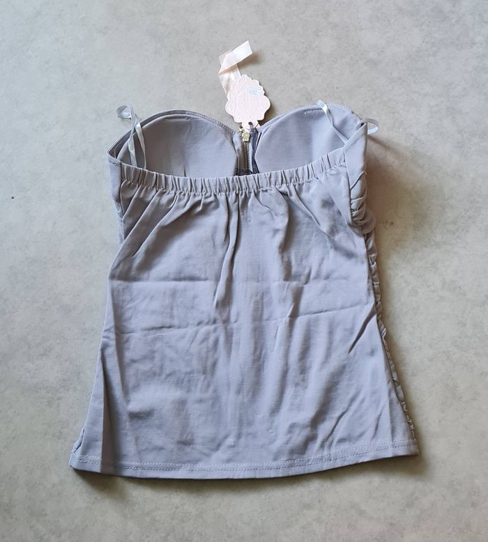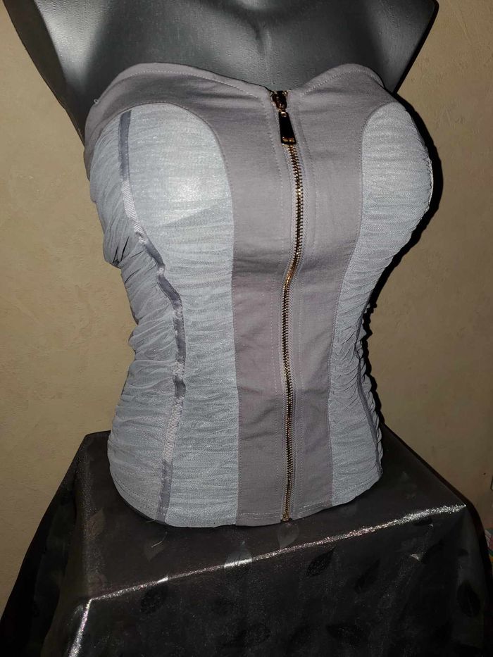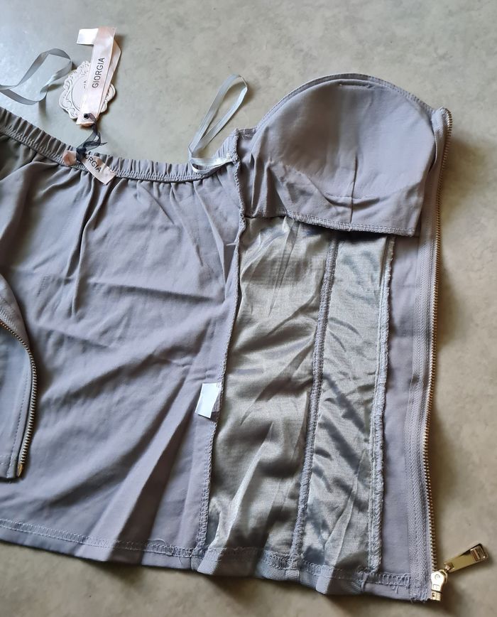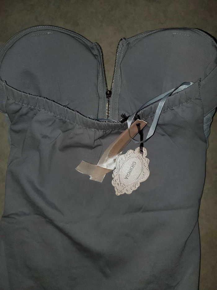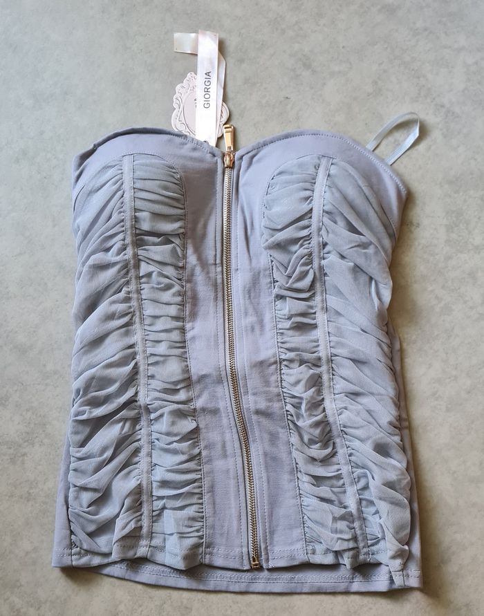 GIORGIA neuf étiquette haut bustier rembourré gris/vert stretch tulle froncée fermeture éclair dorée s'ouvre entièrement longueur 43cm tour de taille 66/70cm tour poitrine 85cm tour sous poitrine 68/76cm (dos élastique) #lesplacardsenfolietailleunique ref12