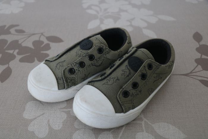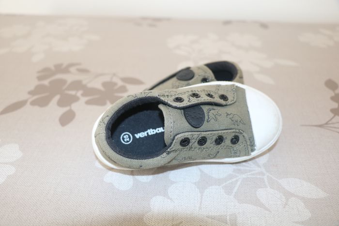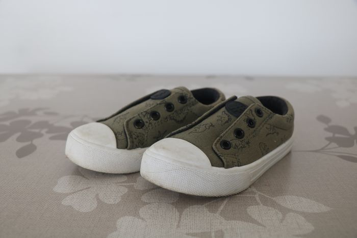 Chaussures kaki en tissu motif dinosaure Renfort à l'avant. Marque Vertbaudet Taille 25 Fermeture élastique devant.
