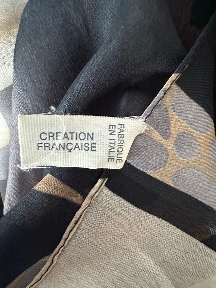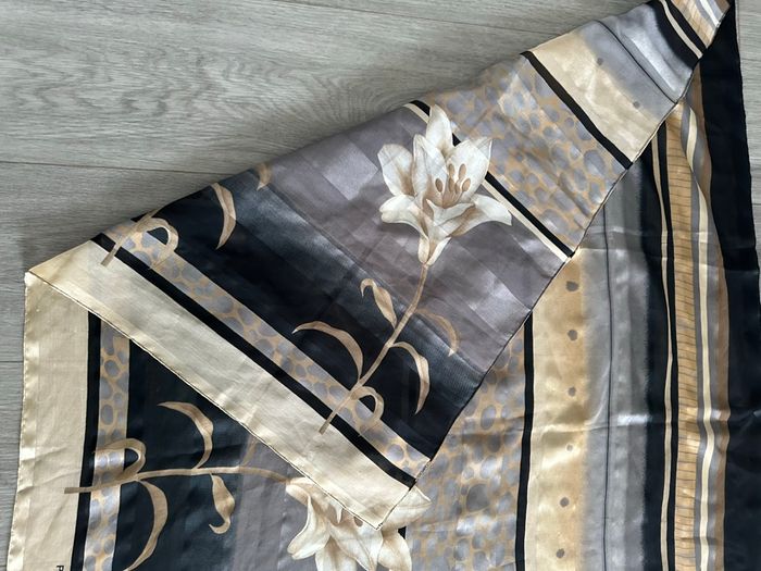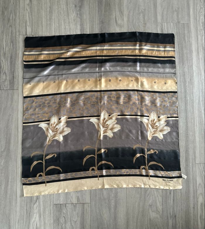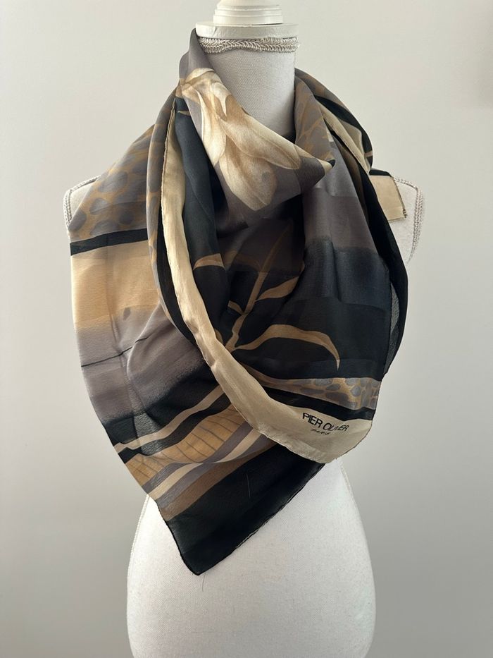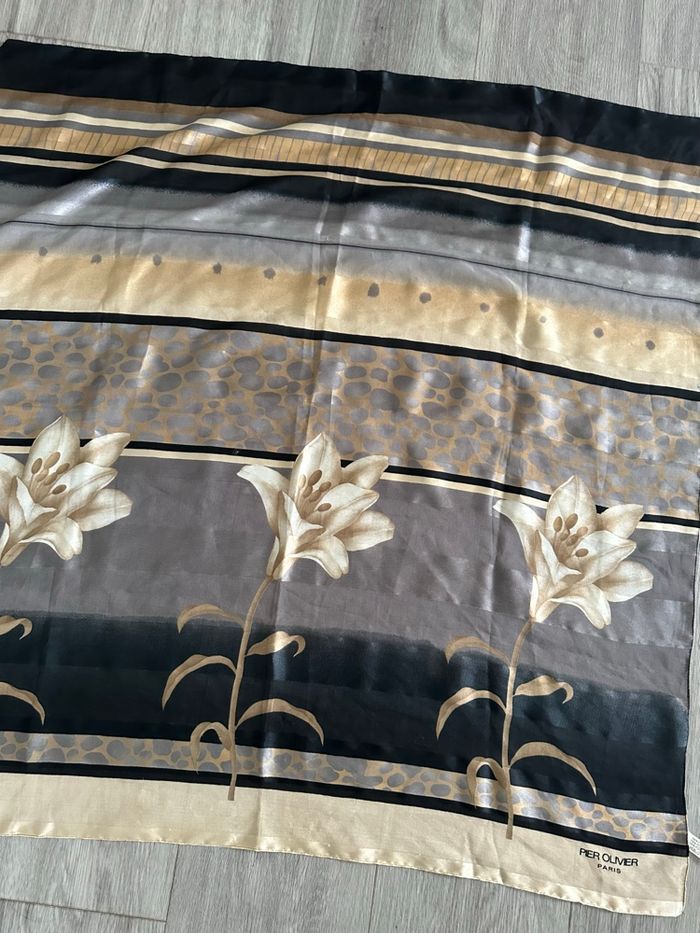 Foulard étole - Excellent état - Imprimés fleurs de lys - Beige crème, gris et noir - Forme carrée - Tissus satiné - Pier Olivier Paris - Création française 🇫🇷 - Fabrication italienne 🇮🇹 - Vintage, années 80’ - 100% polyester - 90x90cm