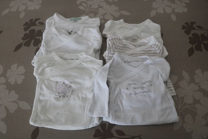 Lot de 6 bodies manches longues Blanc avec motifs Bon état général (quelques tâches) Marque Gemo et Mes p'tits cailloux
