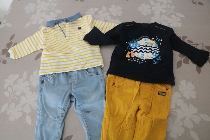 Lot de 2 ensembles: -Ensemble pantalon velours jaune, taille élastique T-shirt bleu marine Marque Terre de marins -Ensemble jean clair, Marque Z Polo manches longues Obaïbi rayé blanc et jaune Taille 6 mois Très bon état