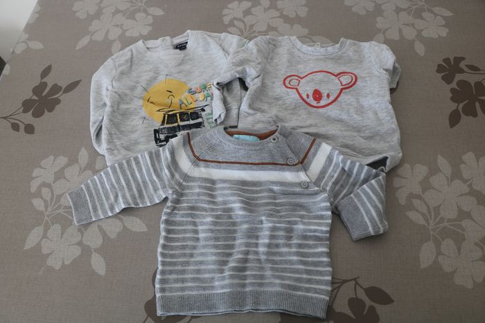 Lot de 1 pull et 2 sweats tons gris Marque: Obaïbi et Kiabi Taille 6 mois Très bon état