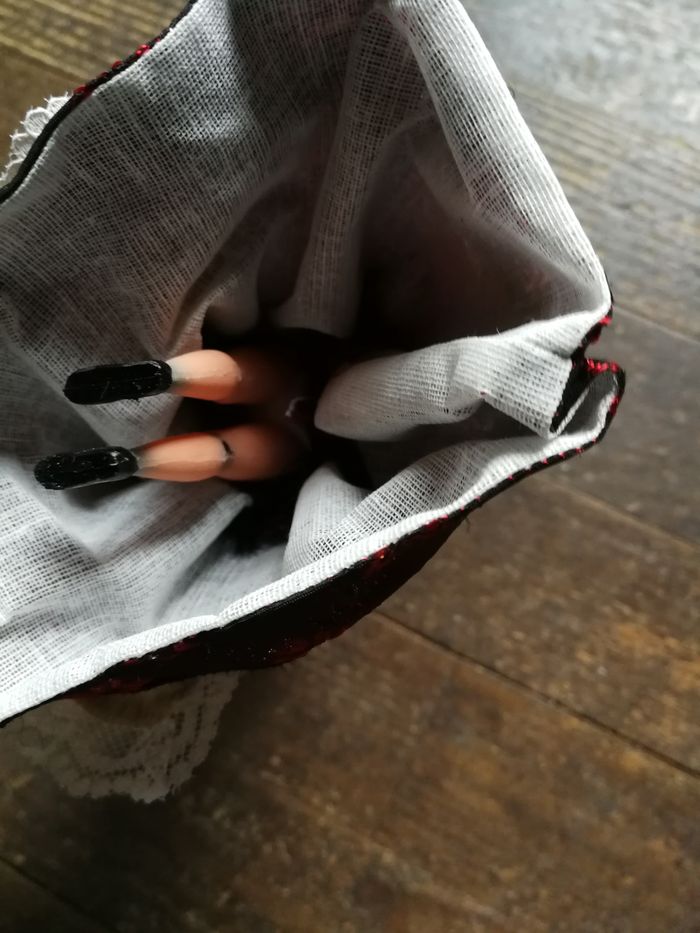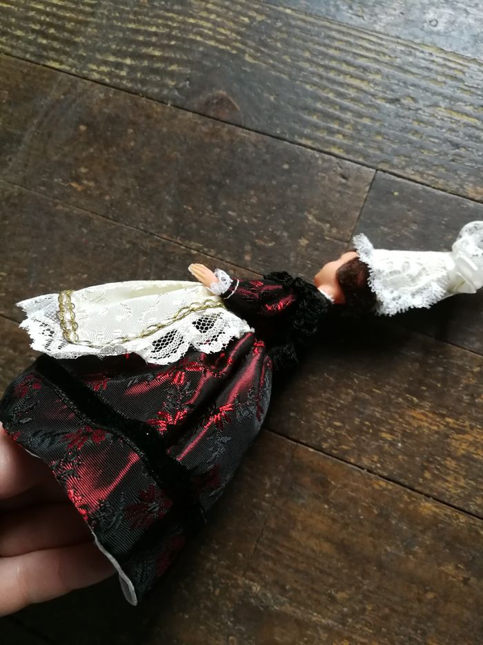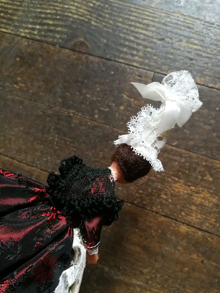 Poupée folklorique coiffe bigoudène en dentelle, robe rouge bordeaux brodée, tablier crème, foulard en dentelle noire, poupée en plastique ancienne 1970/1980, les jambes sont abîmées, les habits sont en très bon état, mais pliés. Belle poupée de collection, régionale. Taille 19 cm.