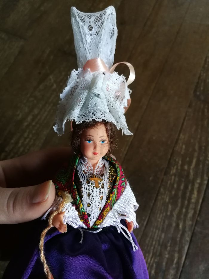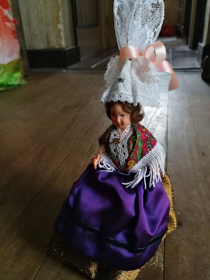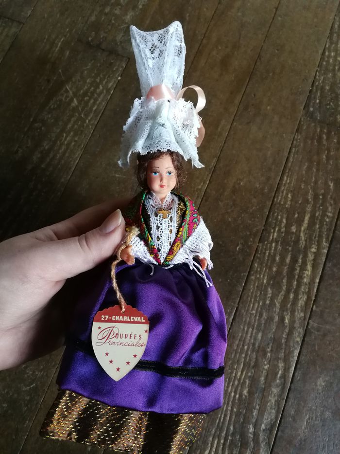 Poupée provinciale 27-Charleval neuve, au dos de l’étiquette est marqué Bréhal. Belle poupée neuve sans emballage, ancienne, en plastique, chapeau en dentelle, robe marron brodée satinée, tablier violet satiné, foulard coloré à franges. Probablement des années 1970/1980, taille 25 cm (chapeau inclus), poids 37g.