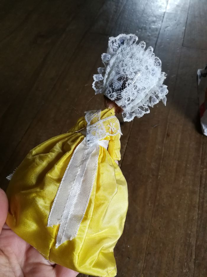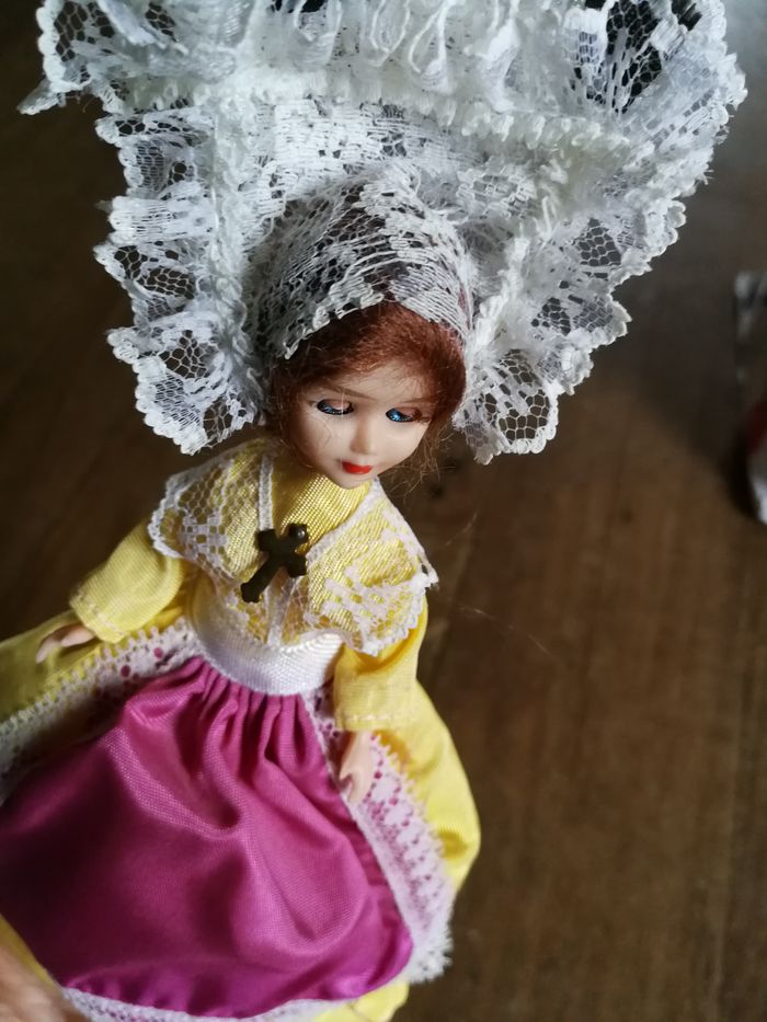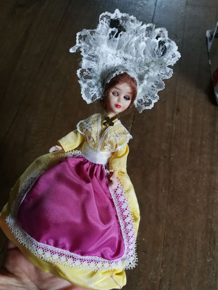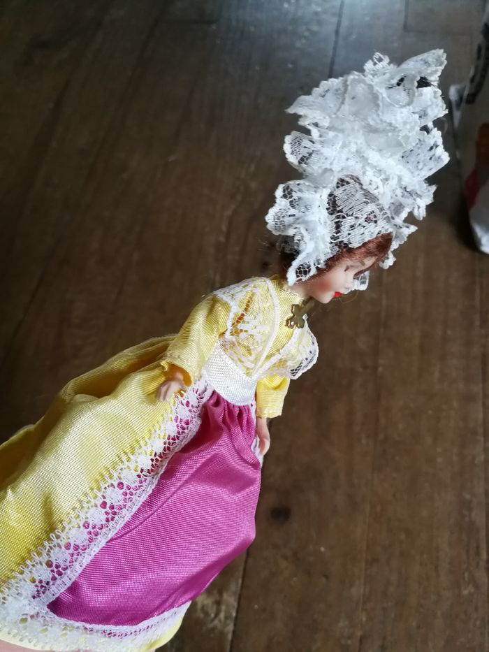 Poupée régionale ancienne Normande robe jaune, en très bon état, clignent des yeux, en plastique, chapeau en dentelle blanche est jauni légèrement, la robe jaune, tablier rose, les habits sont un peu défraichis. Compte tenu son ancienneté 1970/1980, en très bon état général, poids 24g, taille 18 cm.