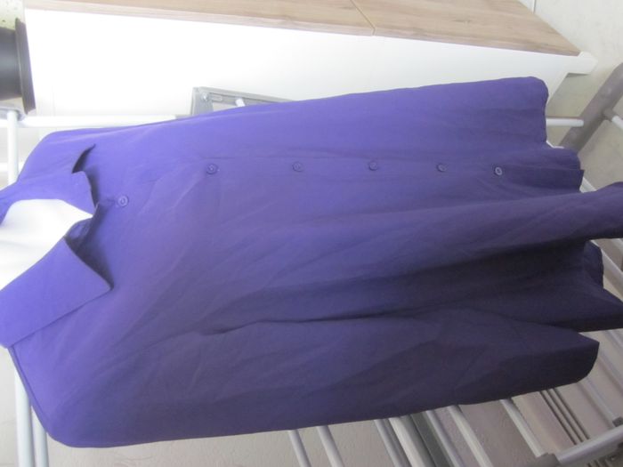M, chemisier ml, long, parait bleu mais violet, base arrondie, dos + long, emery rose