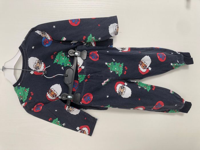 Pyjama garçon, 2 pièces, composé d'un haut manches longues et d'un pantalon élastiqué à la taille. Motif de Noël Marque Primark Taille 18 - 24 mois, 92 cm En très bon état, mis à part que la couleur bleu marine est un peu passée.