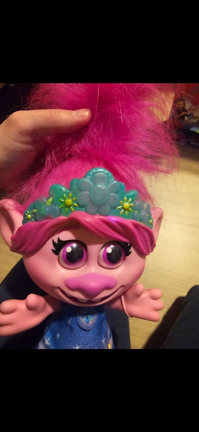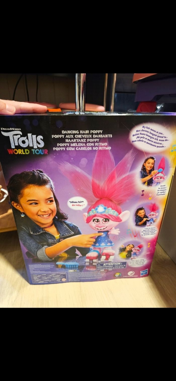 Les Trolls 2 Tournée Mondiale de DreamWorks Hasbro - Poupée Poppy Cheveux dansants Fournie avec son peigne, sa boite et piles incluses. Neuve juste ouverte et testé mais pas utilisé Fonctionne parfaitement
