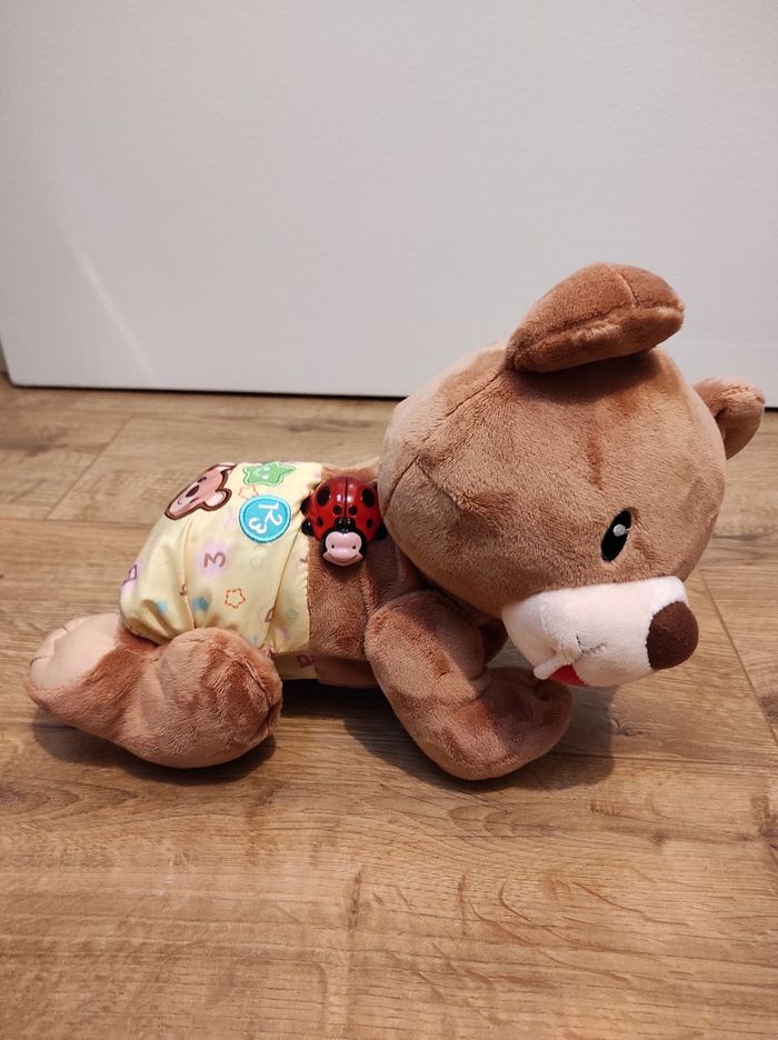 Ourson qui avance tout seul et marche à 4 pattes. Coccinelle lumineuse sur le dos qui clignote au rythme des mélodies.