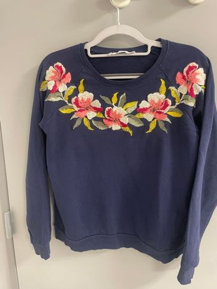 Pull Promod bleu brodé, en bonne état , porté quelques fois de taille M.