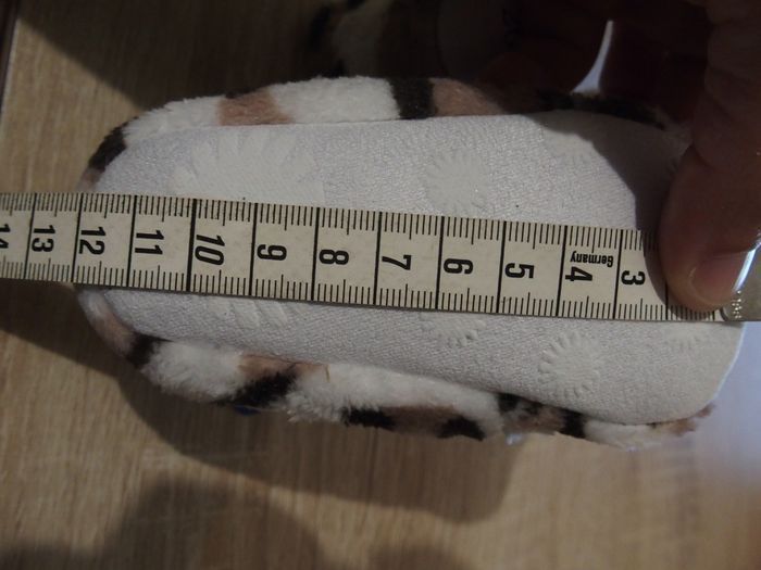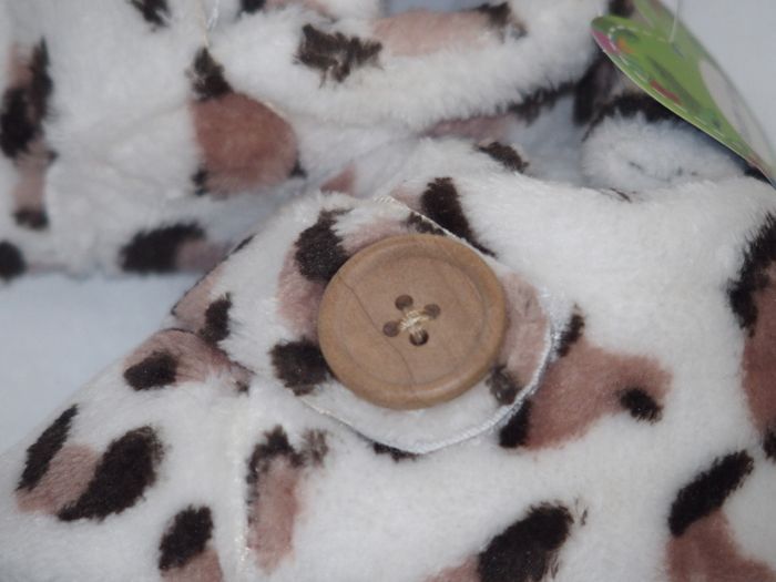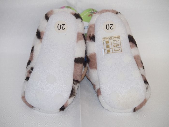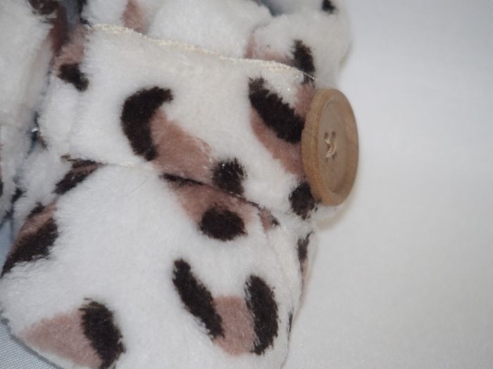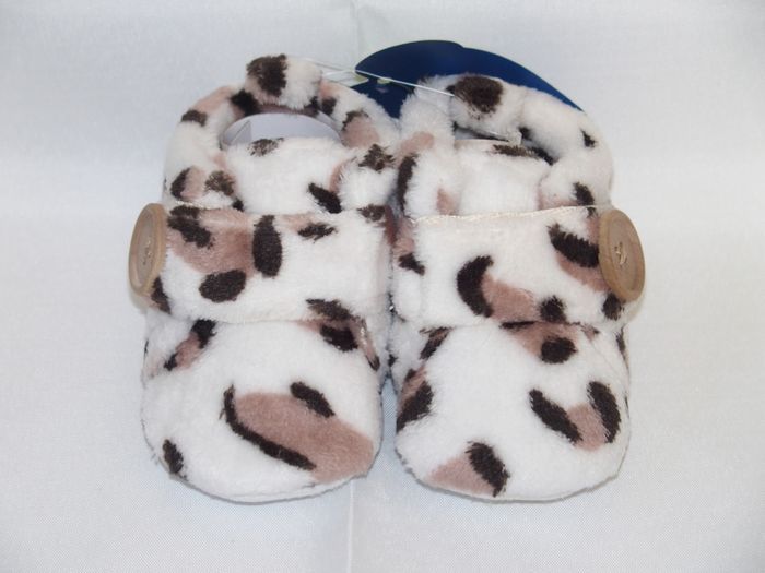 Chausson mou motif léopard en faux poils ras. Semelle avec patchs anti-dérapant. La semelle extérieur mesure environ 12 cm et l'intérieur 11 cm environ. Fermeture par scratch - Le bouton en bois sert de déco. Elles sont neuves. ATTENTION : la taille que j'ai mise dans les descriptions est à titre indicatif par rapport à la longueur du chausson mais en aucun cas la taille indiqué sur le chausson (la taille y est indiqué en cm)