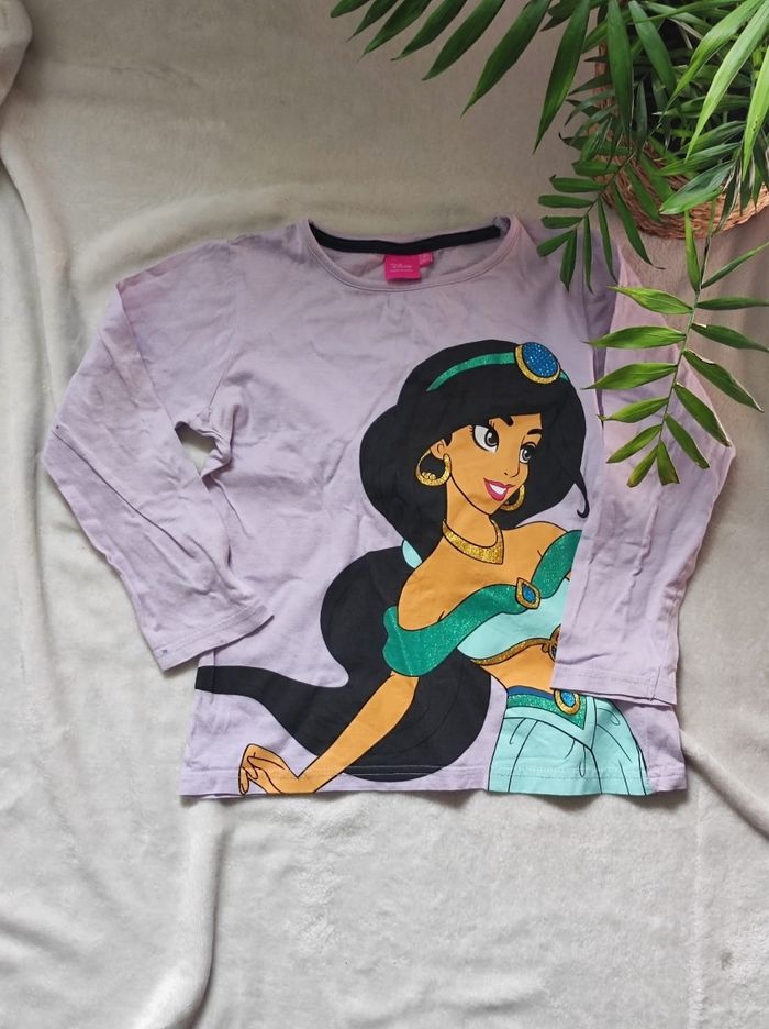 Ensemble deux pièces pyjama princesse jasmine. Pull à manches longues couleur lilas, flocage de la princesse ( quelques traces de feutre sur les extrémités des manches ). Pantalon à motifs ciel étoilé bleu foncé , tissus léger et moyen. Marque Disney en taille 7/8ans. Bon état général.