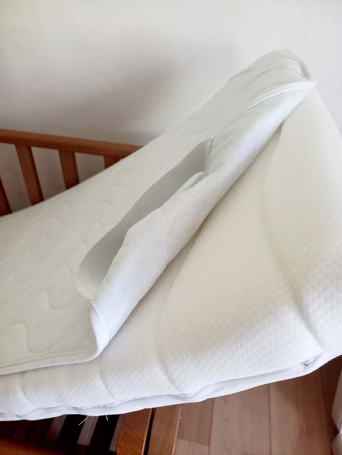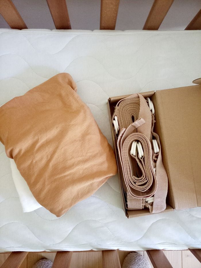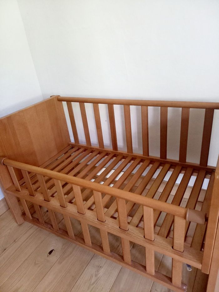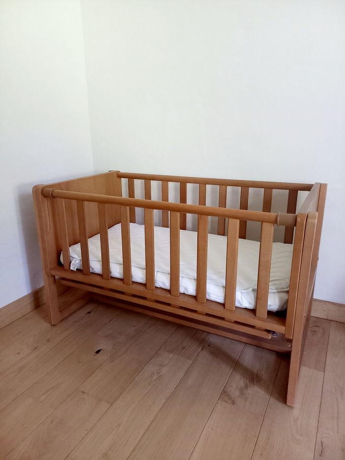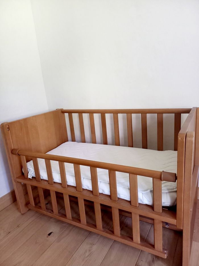 Vendu avec son matelas, protège-matelas, deux housses en coton et les sangles d'attache. Légère petite trace d'usure (cf photo) 🌸 Prêt à l'emploi !
