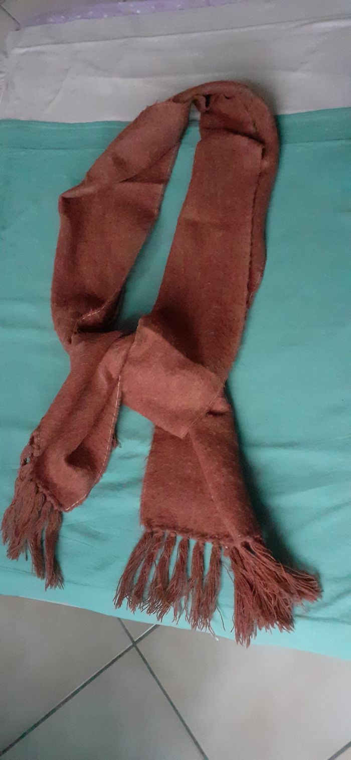 Vends une écharpe en tissu genre feutrine, chaude et douce, ne pique pas, couleur marron uni. Longueur : 192 cm Largeur : 25 cm