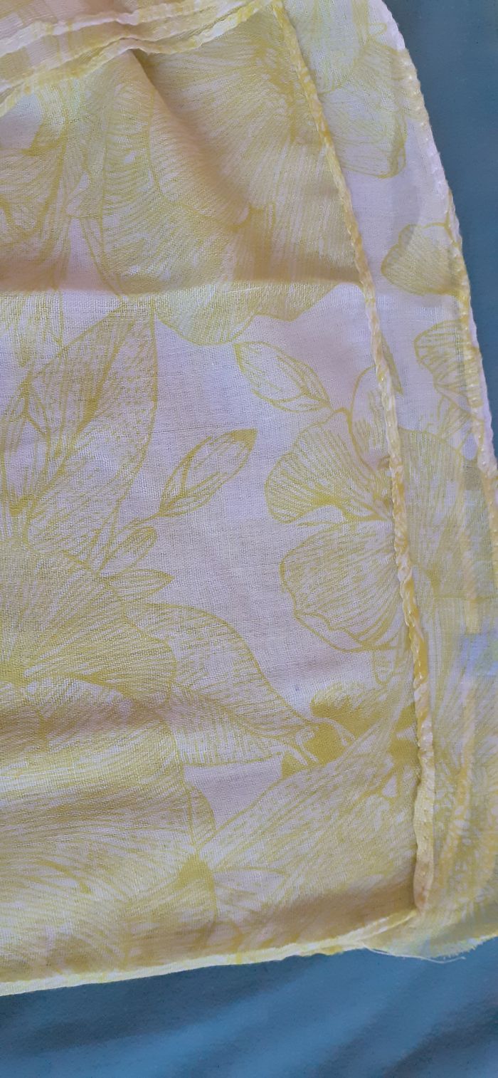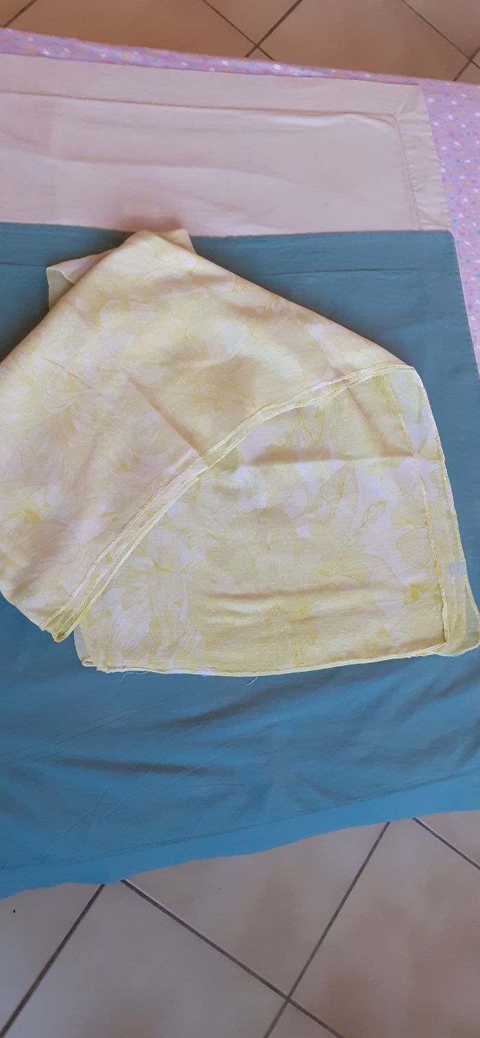 Vends une écharpe fine, longue et large en tissu très doux et chaud, 100 % viscose, couleur jaune pâle avec dessins blancs. Longueur : 180 cm Largeur : 84 cm.