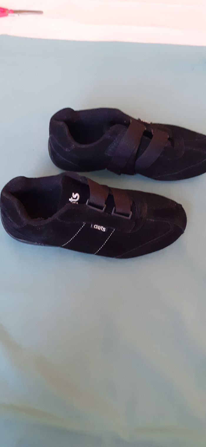 Vends une paire de baskets à scratch, en suédine, peu portées, marque DETS, couleur noir, pointure 37.
