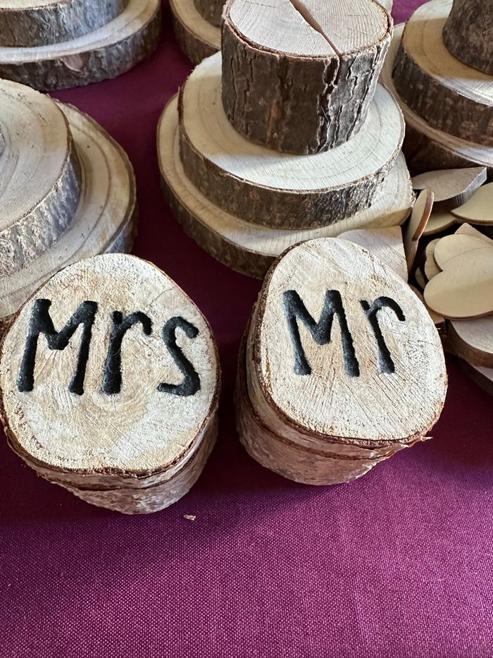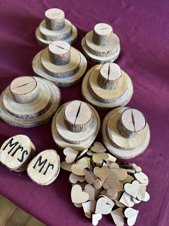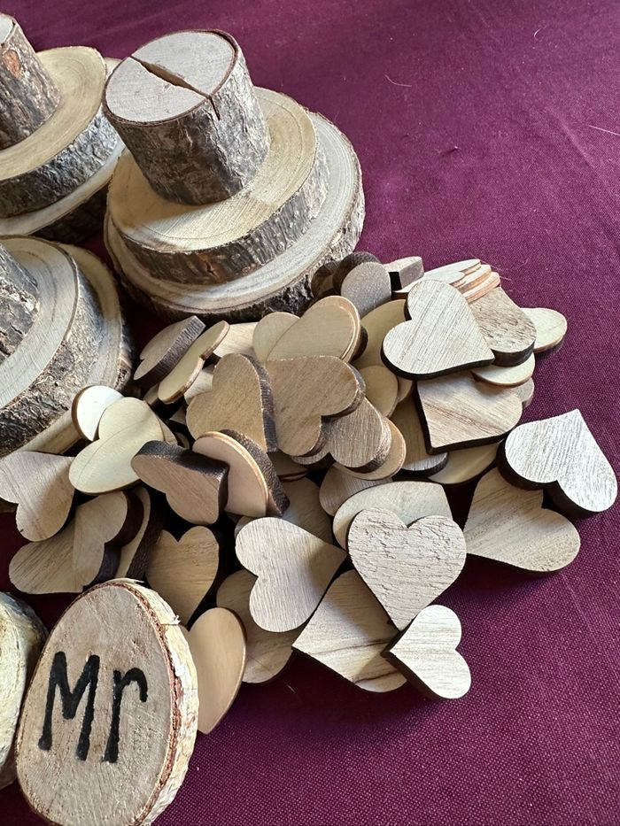Lot deco mariage champêtre Composé de 2 portes alliances 7 portes menu Une 50aine de cœurs en bois Négociable raisonnablement