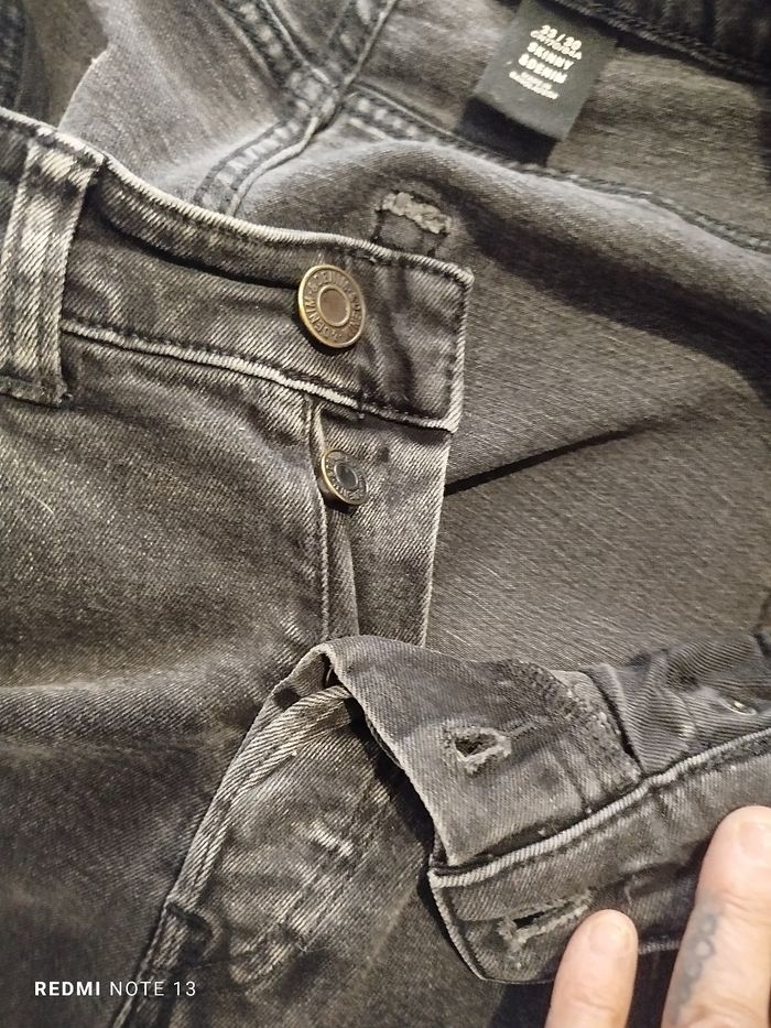 #kytie42homme. Jeans skinny taille 42 (33/30) de marque skinny denim en excellente état noir troué aux genoux poche avant et arrière fin aux chevilles comme neuf mesure de la taille 42 cm tour de cuisse 55 cm vers 100 cm peut-être aussi unisexe ref 204